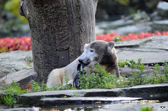 Kurz nach halb zehn traf ich im Zoo ein. Entgegen meiner sonstigen Gewohnheit ging ich nicht sofort zu Knut, sondern begann sofort mit der Bärenrunde bei den Malaienbären. Der Grund für diesen Umweg waren zwei Kilo Nüsse und ein 3-Kilo-Kürbis, die immer schwerer wurden. Ich hängte wieder alles ans Bärentor. Wer klaut schon einen Kürbis.