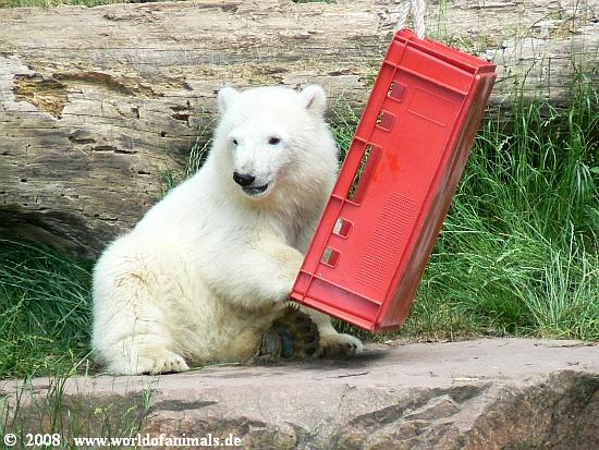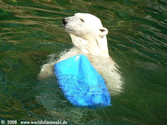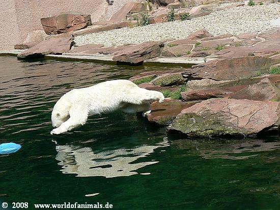 Nebenan auf der Anlage: Eisbärmama Vera, die dort alleine lebt. Sie war ziemnlich aktiv und sprang sehr oft ins Wasser und spielte mit den blauen Plastikkanistern. Ab und zu füllt man einen davon mit Fressbarem und die Bärin hat dann mindestens einen Tag lang Beschäftigung um alles wieder aus dem Kanister heraus zu bekommen.