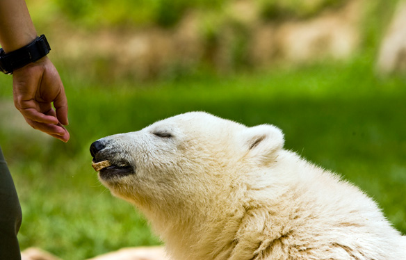 Hm, das schmeckt! Flocke kriegt ein Leckerli von Pfleger Harald Hager und genießt. (Foto: Ralf Schedlbauer)