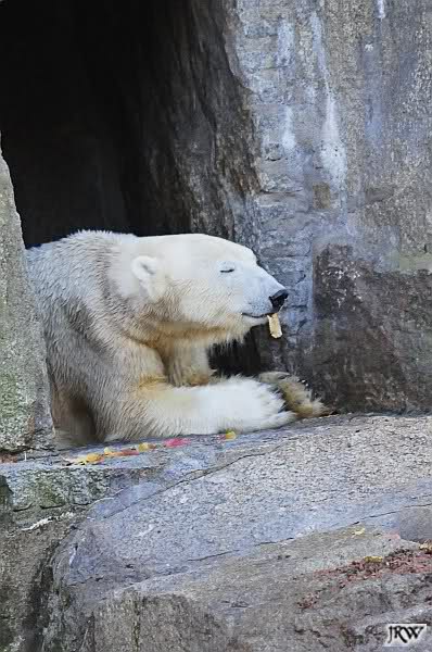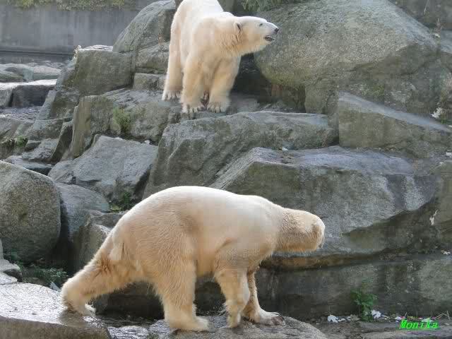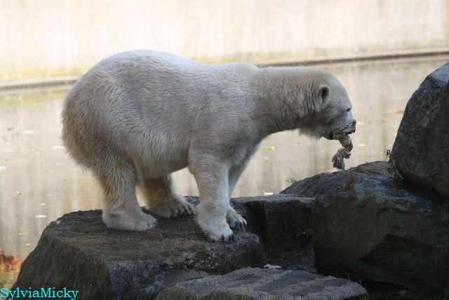 Es herrschte heute wieder Ruhe auf dem Bärenfelsen. Nach der Fütterung ging Knut auf seine rechte Ecke und es sah aus, als suchte er die Kordel. Diese hatte Tosca vorher an sich genommen und nach oben auf die Felsen gelegt. Dann kam Katjuscha und legte die Kordel vor ihrem Höhleneingang.
