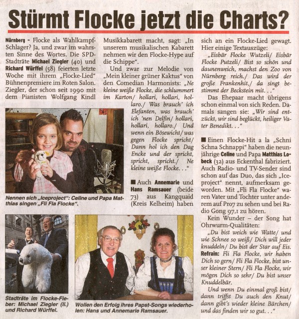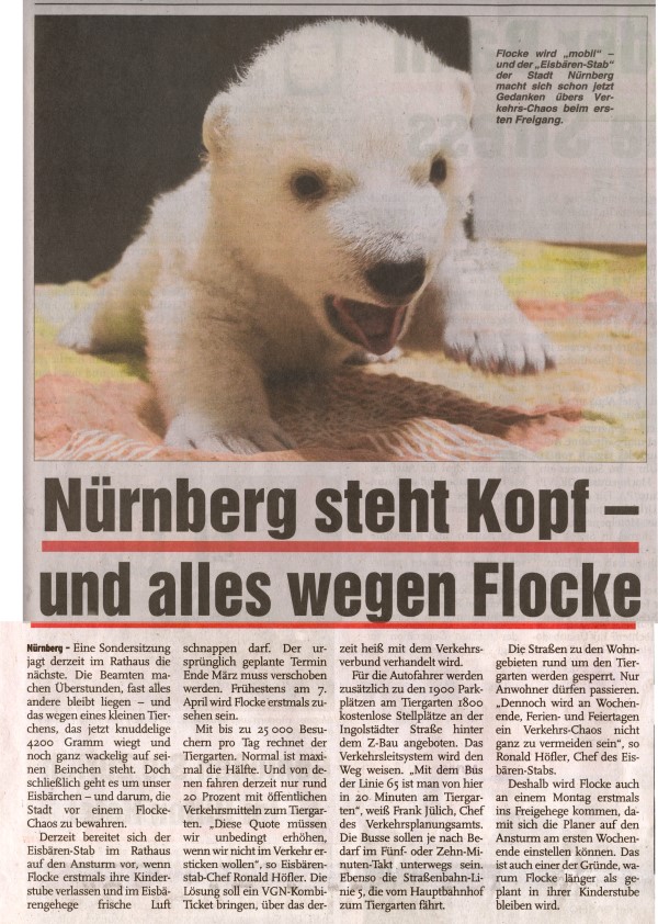 Im Laufe des heutigen Tages wurde möglicherweise durch ein Missverständnis eine Fehlmeldung über den Gesundheitszustand des Eisbärin Flocke verbreitet. Die vom Tierarzt Dr. Bernhard Neurohr bei der heutigen Pressekonferenz angesprochene Infektion des Magen-Darm- Traktes bezog sich auf den Beginn der Handaufzucht am 8. Januar 2008. Die Behandlung war vorbeugend durchgeführt worden aufgrund von geringen Schleimbeimengungen und Keimen im Kot. Das Tier hatte kein Fieber und es waren keine weiteren Krankheitserscheinungen zu diagnostizieren. Der Einsatz des Antibiotikums wurde bereits am 21. Januar 2008 abgeschlossen. Aufgrund des nach wie vor im Magen-Darm- Trakts befindlichen Heus wird vorbeugend ein Mittel gegen Hefepilze eingesetzt.
