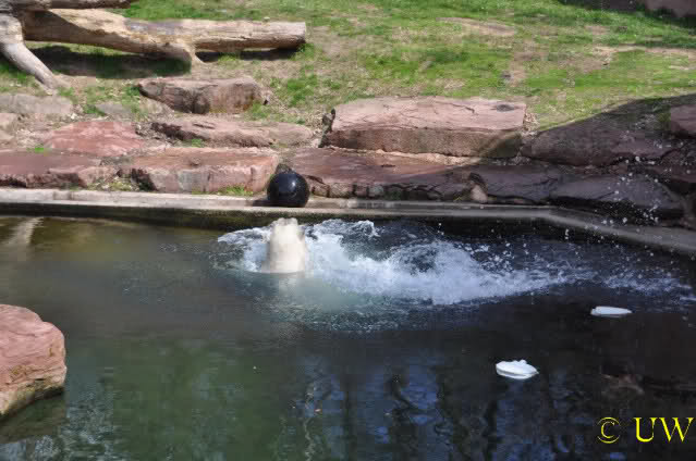 Wie man schon auf etlichen Bildern sehen konnte, befördert er seine Kugel immer irgendwie ins Wasser, springt dann nach und "fängt" sie wieder ein.
