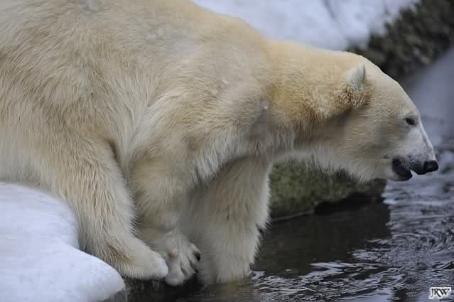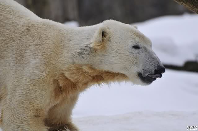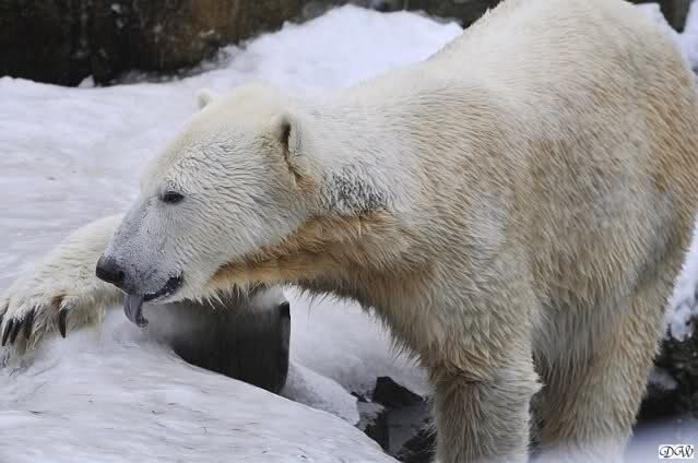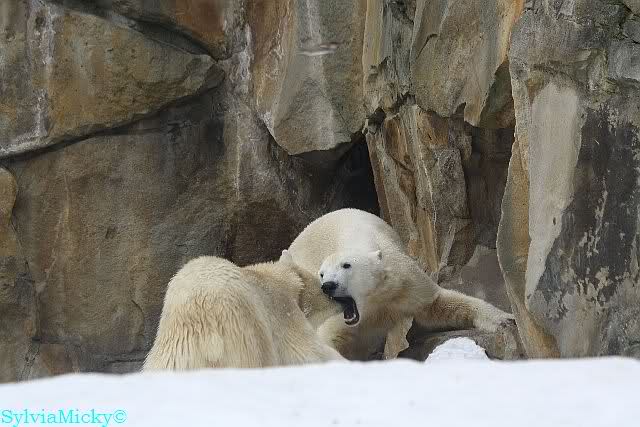 Knut schnüffelte eine ganze Weile an einer Höhle auf der Anlage. Sofort kam sie angerannt, steckte ihre Schnauze bis zu seinen Mandeln, weil sie bestimmt dachte er frisst etwas. Das war Knut aber zu viel und er brüllte sie laut an. Sie zog sich dann zurück.