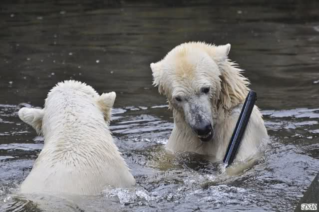 Viel haben Knut und Gianna heute nicht unternommen. Allerdings zeigte Gianna einmal mehr, wer Herrin im Haus ist. Knut hat Salat, Gianna möchte ihn haben. Knut spielt mit einem Ball (natürlich immer nach oben schauend wo sie denn bleibt), Gianna kommt und nimmt ihn weg. Knut spielt mit dem Schlauch, Gianna kommt und holt ihn. Nun sollte allerdings nicht der Irrtum aufkommen, dass Knut darüber unglücklich ist. Mitnichten! Bedeutet es doch, dass sie zu ihm kommt und eventuell konnte man dann ja ein wenig spielen.