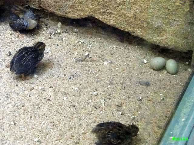 Nachwuchs bei den chinesischen Zwergwachteln. Die Kleinen verstecken sich unter Mama`s Gefieder.
