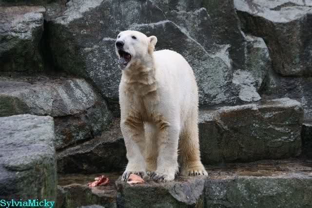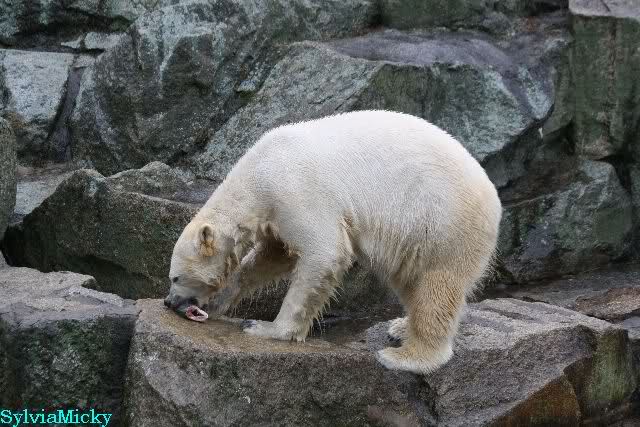 Ich hatte eigentlich gedacht, daß heute Knut drinnen ist und die Drei auf der kleinen Anlage, wegen Reinigung der Anlage. Dem war aber nicht so. Vor der Fütterung war Ruhe. Zur Fütterung gab es außer Fleisch einen schönen großen Lachs für jeden Bären. Spendiert von einer Knutfreundin aus Hamburg. Danach gab es noch Rosinenbrötchen und andere Brötchen für die Bären.