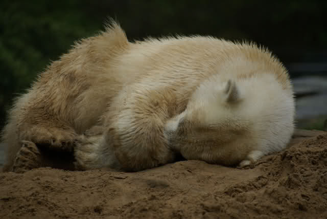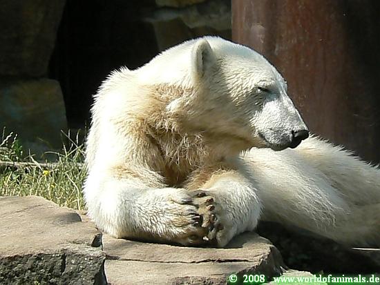 Ich machte bei den Eisbären wieder eine ausgedehnte Seele-Baumel-Pause und betrachtete die vier Großen. Sie bewegten sich kaum und dösten zum Teil. Dann ging ich weiter, an den Nasenbären und Wölfen vorbei, um endlich zu Knut zu kommen. Knuti lag weiter hinten im Gehege und döste in der Sonne. Er hatte sein Köpfchen auf einem großen Stein gebettet, seinen Jutesack als Kopfkissen darunter. Seine Augen waren halb geschlossen und es sah aus, als würde er die Wärme der Sonne genießen.
