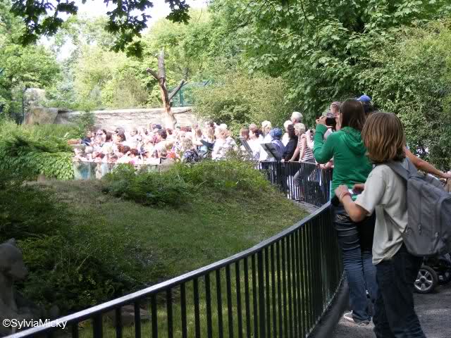 Danach wurden die Braunbären gefüttert. Herr Dörflein warf ihnen wieder mit Schwung Nüsse auf die Anlage, diesmal ohne den Eimer mitzuliefern. Was Knut nun genau bekam, konnte ich leider wieder nicht sehen, denn es war wirklich rappelvoll. Gelegentlich sah ich eine Wasserfontäne und – wenn ich mich auf die Zehen stellte – Knutis nassen Rücken.