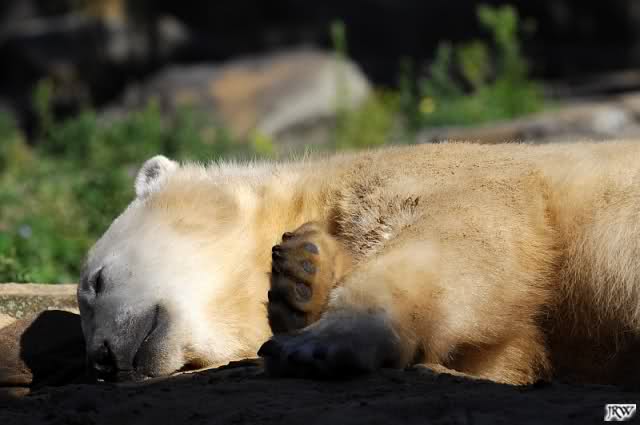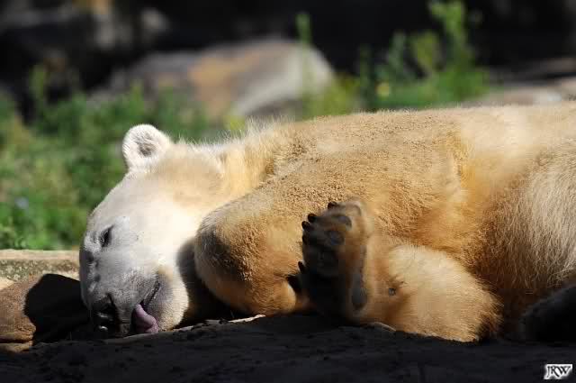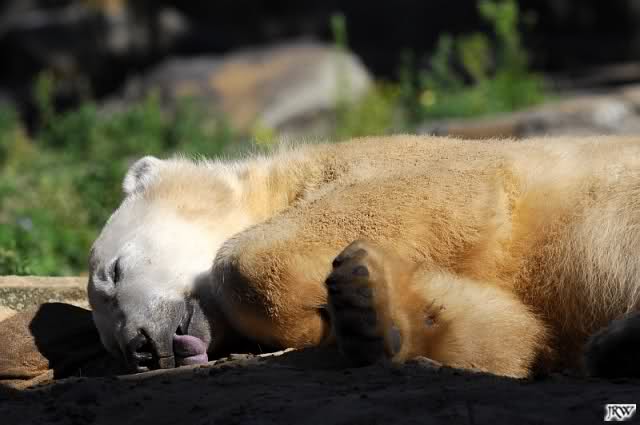 Spät bin ich heute aus dem Zoo zurück. Es war dann doch noch ein herrlicher Sommerabend. Knut, der (wie mir berichtet wurde) am Tag sehr lebhaft war, schlief sich am Abend aus, war nur mal kurz im Wasser und spielte sich dann wieder in den Schlaf.