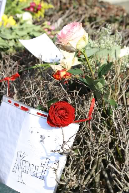 On Sunday, hundreds of people gathered at Berlin Zoo to lay down flowers and leave messages. "Thanks for all the happy memories," "Bye Knut," "We loved you so much." Many were in tears. "He was like our child. We watched him grow up," said one elderly lady, with tears running down her face.