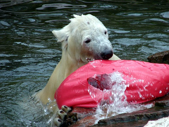 Was mich heute auch sehr gefreut hat, war eine äußerst agile Vera, die mit einer roten Plastikkiste gespielt hat. Flocke hatte daran großes Interesse und hing die ganze Zeit an der Glasscheibe. Man hätte ja denken können, sie interessiert sich für Vera, aber es war eindeutig die Kiste. Das konnte man sehen, als diese dann verwaist an der Scheibe rumdümpelte und Flocke von ihrer Seite aus zu gerne drangekommen wäre. Vielleicht sollte sie ihr Spielzeug nicht immer versenken, dann müsste sie nicht nach dem der Mutter schielen Auf jeden Fall hat Vera einen guten Eindruck auf mich gemacht, sie scheint mit dem Tod ihres Nachwuchses gut zurecht zu kommen. Es ist halt doch was völlig anderes, wenn sie sehen kann, was passiert und ihr nicht einfach von einer Minute auf die andere das Kind genommen wird, so wie es bei Flocke war.