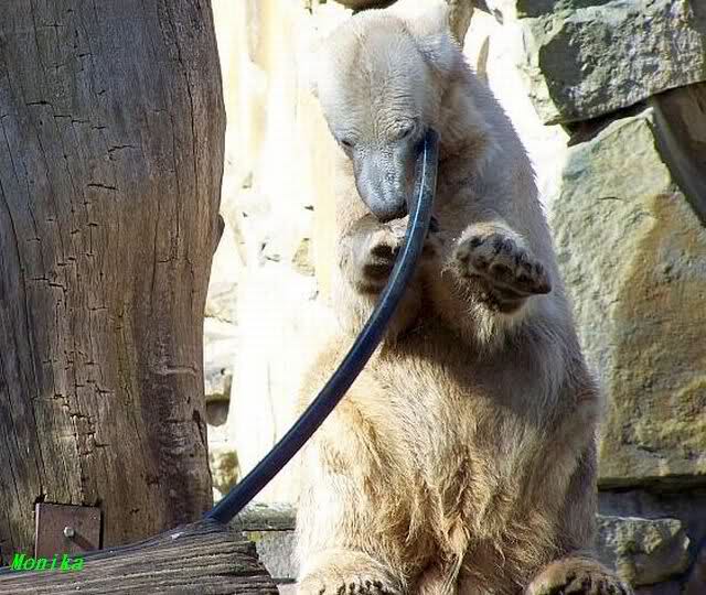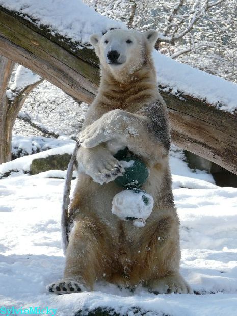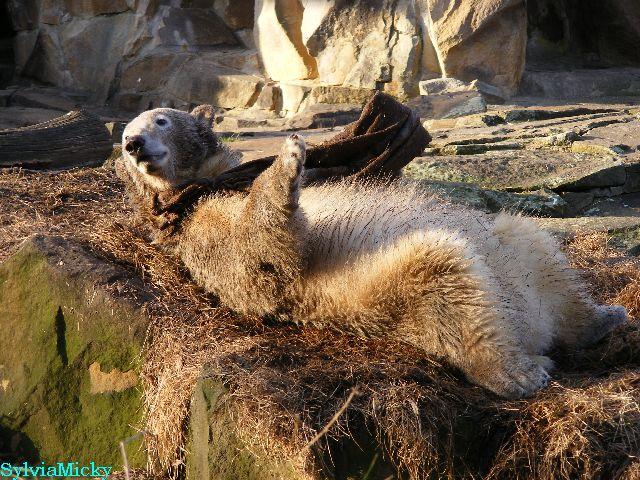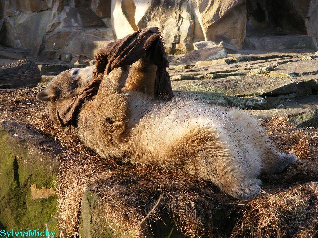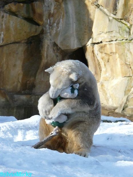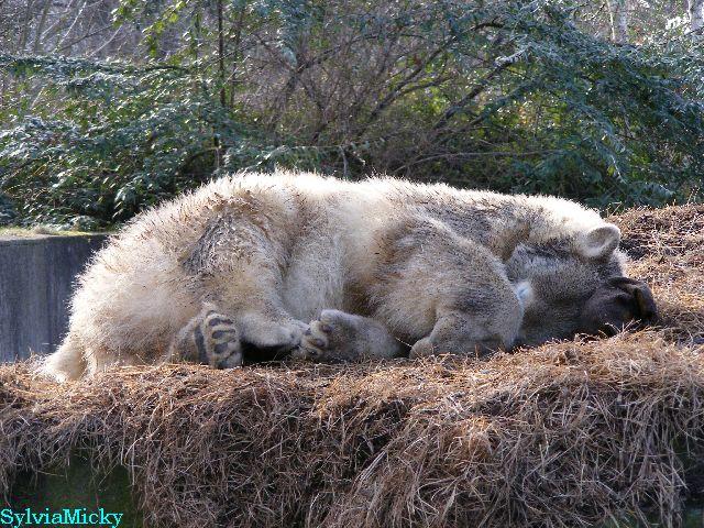 Dieses liebe ich auch. Knut war so müde und schaute zu als vor seinem Gehege Tische aufgebaut wurden. Als sich ein paar Minuten nichts tat, schlief er im Sitzen ein. Als er ein Geräusch hörte, riss er die Augen sofort weit auf. Eben Knut, der einfach nicht einschlafen wollte wenn etwas los war.