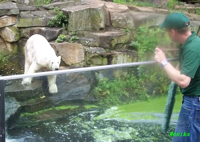 Knut und der "Scheiben-Putzer". Knut war immer sehr interessiert, was so an seinem Gehege passiert. So auch als der junge Pfleger die Scheiben putzte. Auch der Pfleger hatte seinen Spaß.