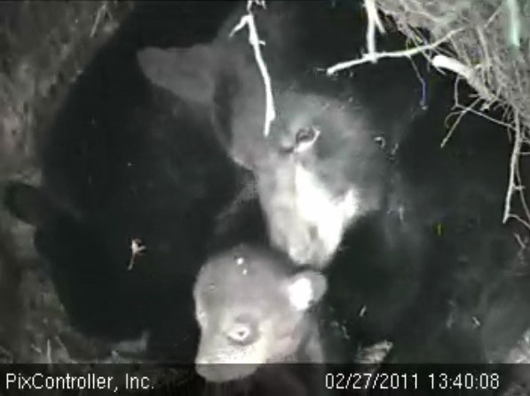 Ich kam von einer Vergnügungsreise mit meiner Frau Donna zurück und denke jetzt bin ich an der Reihe ein Update zu schreiben. Ich höre, dass es heute in Lilys Höhle ziemlich ruhig war. Trotzdem haben wir das Filmmaterial, aufgenommen um 13:41 CST, untersucht um festzustellen ob eines der Jungen vielleicht seine Augen geöffnet hat. Kann das sein? Wir denken, dass sie die Augen mit 5-6 Woche öffnen, diese Jungen sind grade mal 4 Wochen alt. Ein Video von dem fraglichen Filmmaterial kann man hier sehen: http://www.youtube.com/watch?v=KSHU4162RZY.