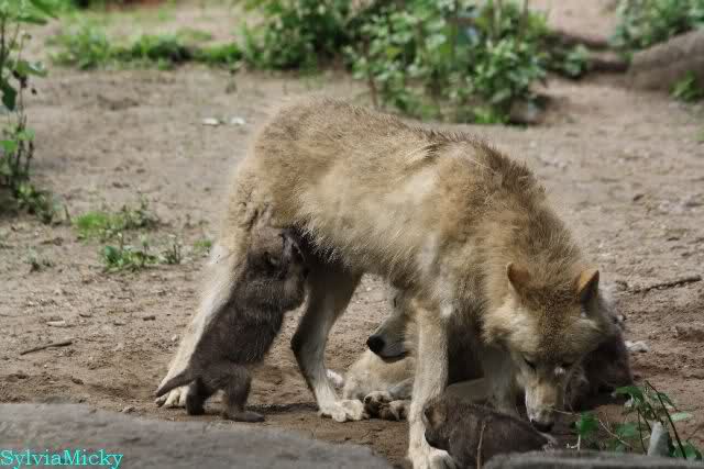 Auf Jessies Video sieht man so schön, wie aktiv die Kleinen schon sind. Ich könnte da stundenlang zuschauen. Die Mutter kann einen ja schon etwas leid tun. So oft wie ich heute bei den Wölfen vorbei ging, hingen die Kleinen immer an der Milchbar. Aber die junge Mutter sieht das sehr gelassen.