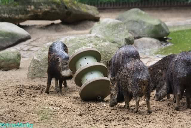 Die Pekaris kippten die Tonne um, so daß das Futter aus den Löchern raus kam und sie es fressen konnten