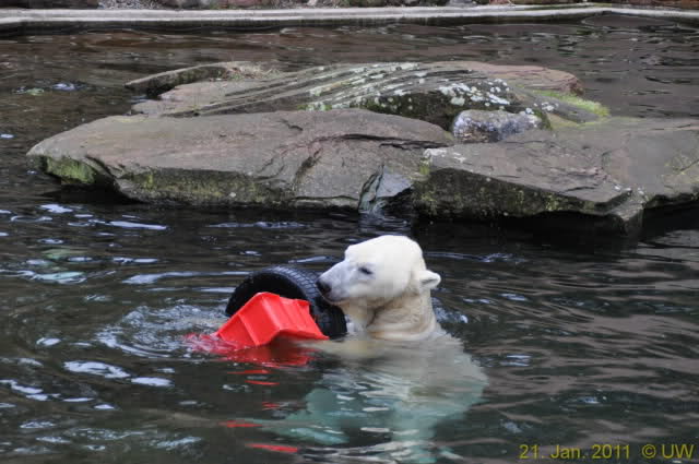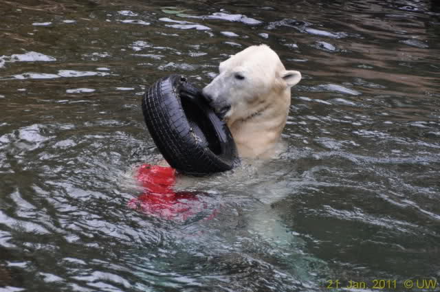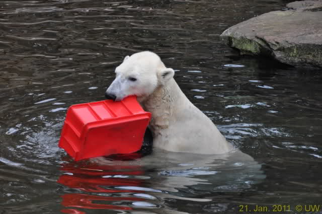 Auf der folgenden Bilderserie kann man schön sehen, wie schnell ein müder, gelangweilt schauender und gähnender Eisbär munter wird, wenn er ein paar Spielzeuge bekommt