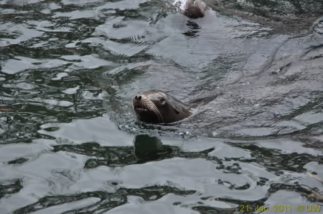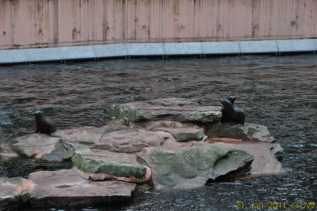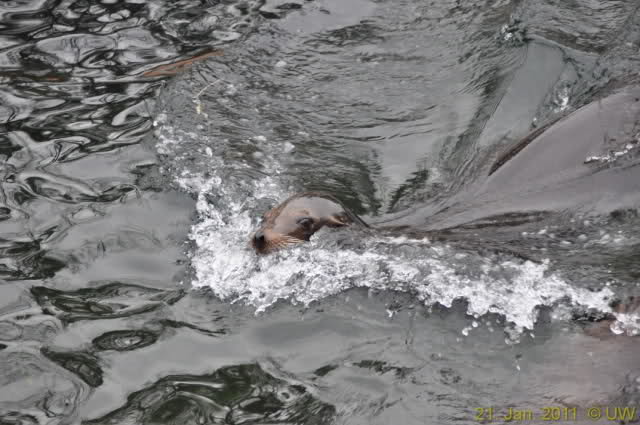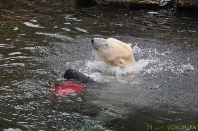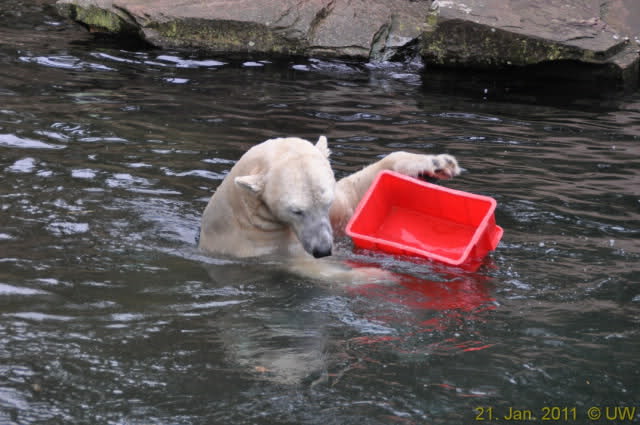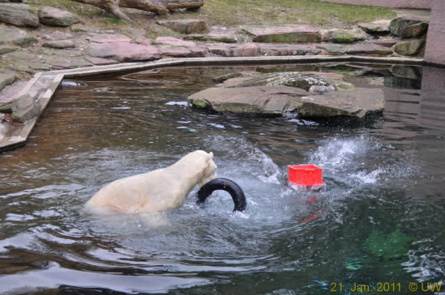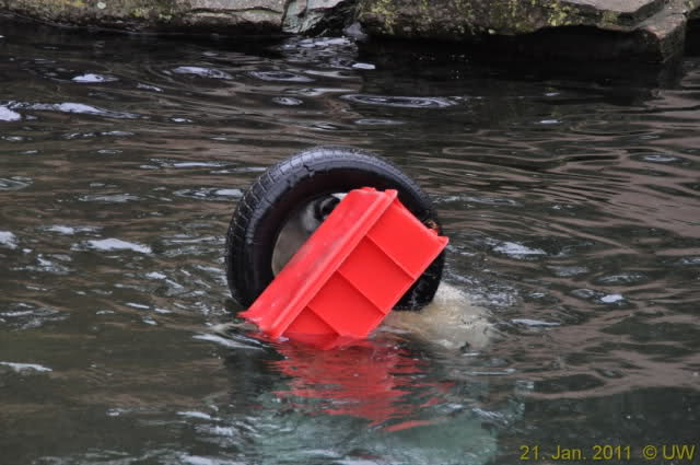 Kurz darauf kam die Tierpflegerin und warf einen Reifen und eine Kiste ins Wasser.
