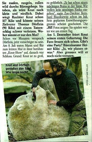 The pics of Knut playing with TD showed a relaxed TD and a very HAPPY Knut. The writer of the newspaper article must have misinterpreted the photos or did not even look at the pictures when he/she wrote the articles.