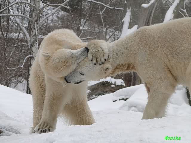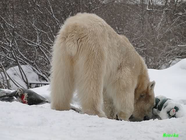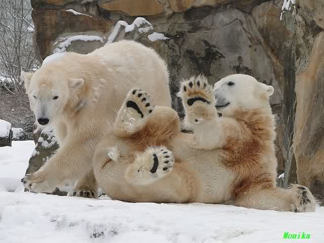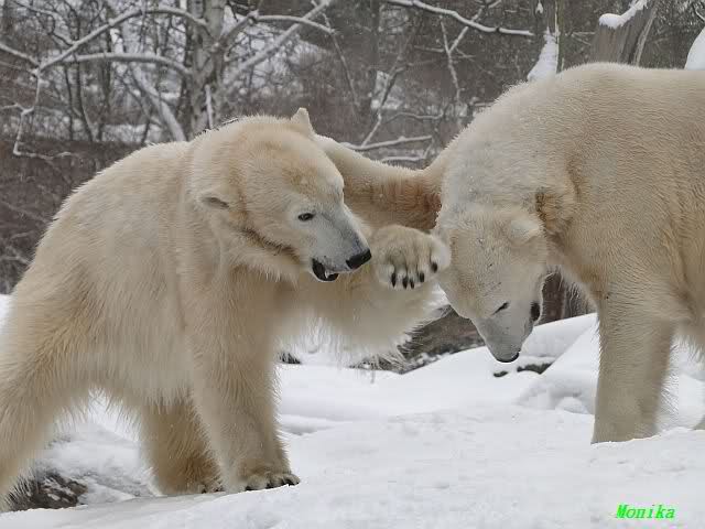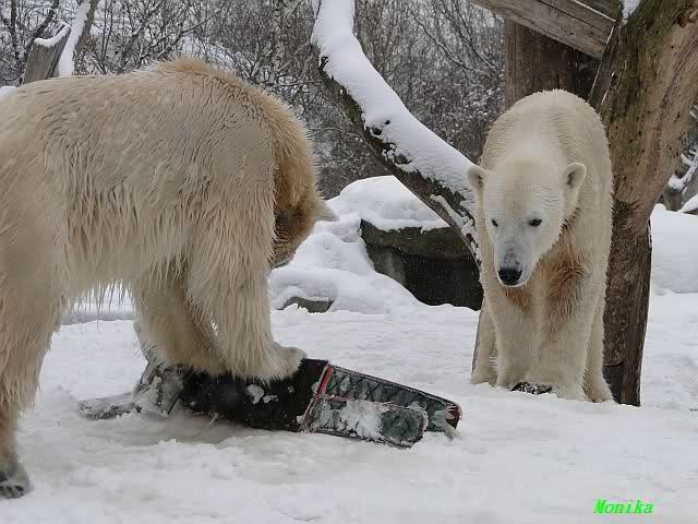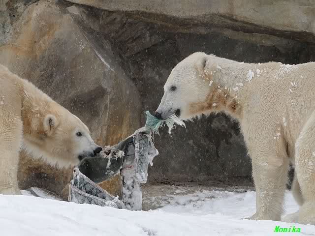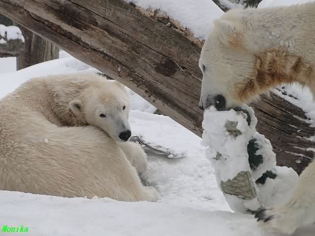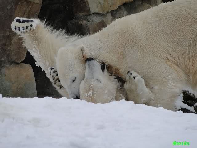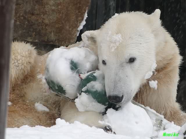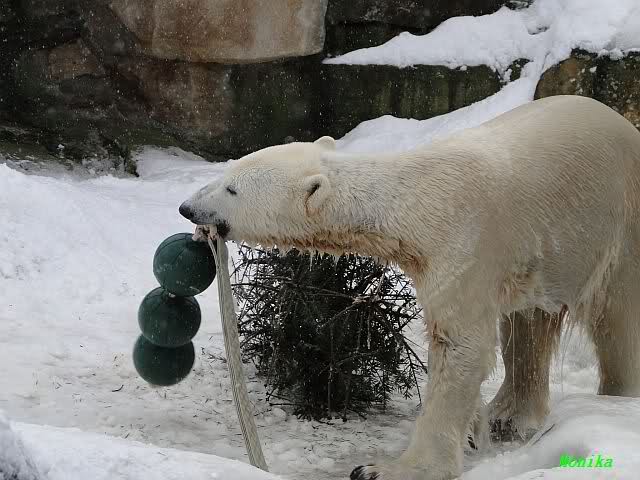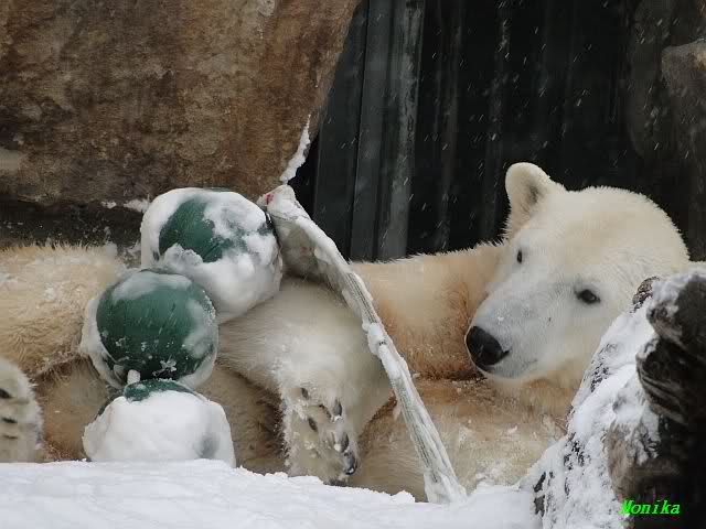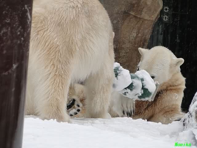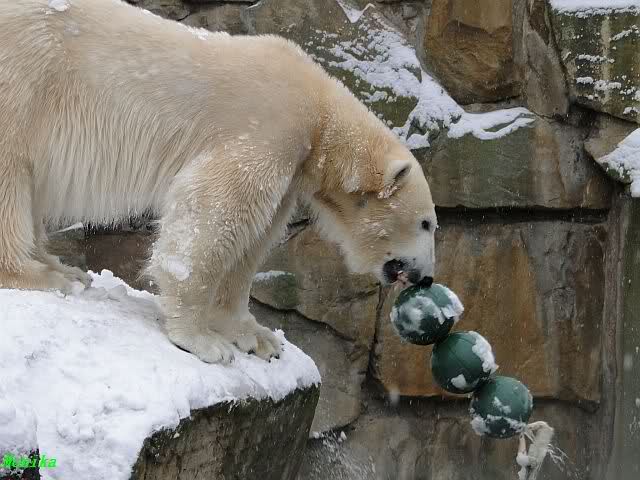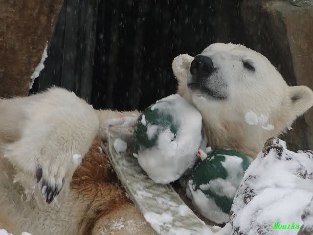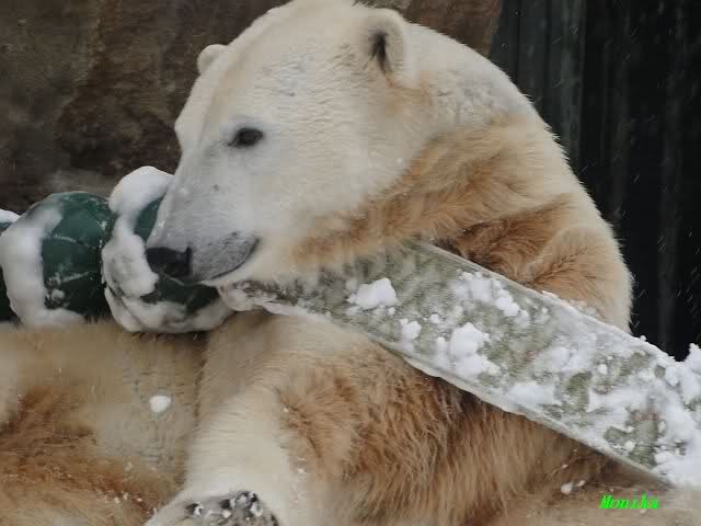 Well, Doris, you have a great style. Thanking the door keepers by making a grand reverence must be certainly appreciated (although I hope that your knee is not hurting). Most probably, next time when you visit Zoo Berlin, you can get a free entrance (however, I think that you have an annual ticket, well … too bad). But nonetheless, I have to disagree with you, once more, I am afraid. Although you promised Mervi a place in the third row or so, I think that you have taken the wrong decision. We all know by now how much you adore Knuti’s beard and so (ARHEEMMMM) and as such, you must be grateful that at least she gave him a moustache. But, HALLOOOOHHOOO, she put that moustache on top of his snout instead of under his nose. And therefore, NO place in the third row, but somewhere in the tenth of eleventh one!!! I have already planned to have a serious word with this lady when I am in Berlin.