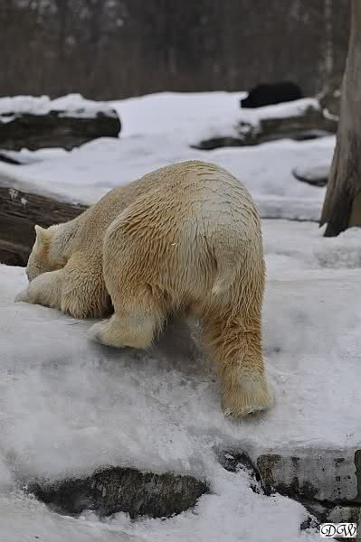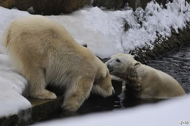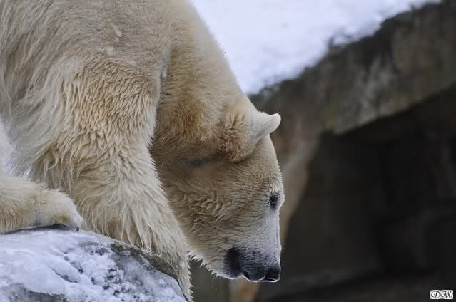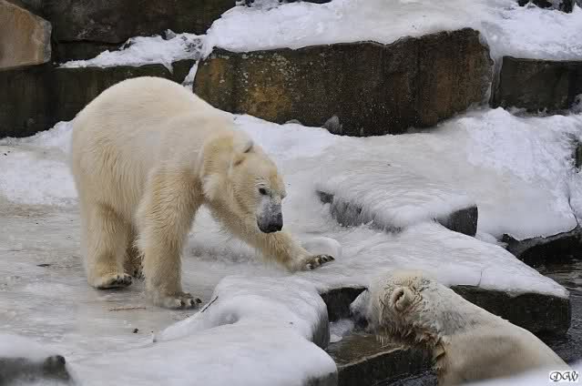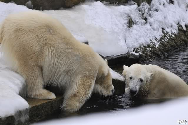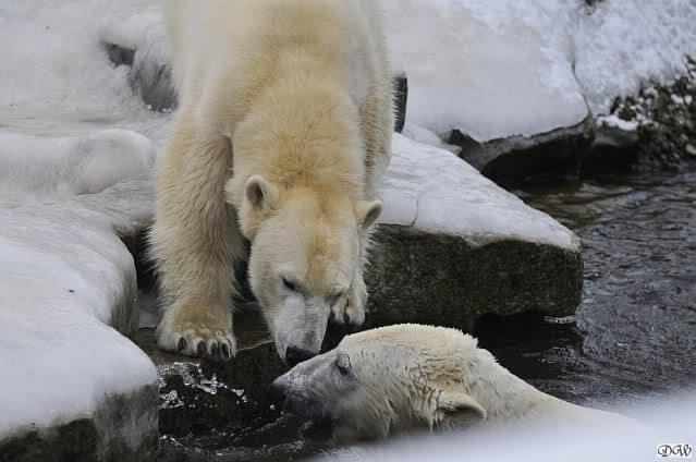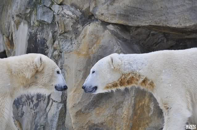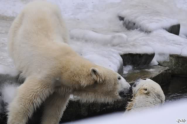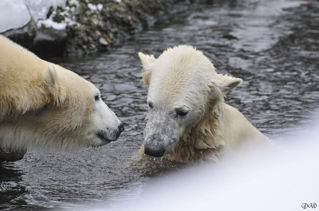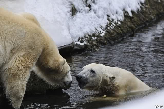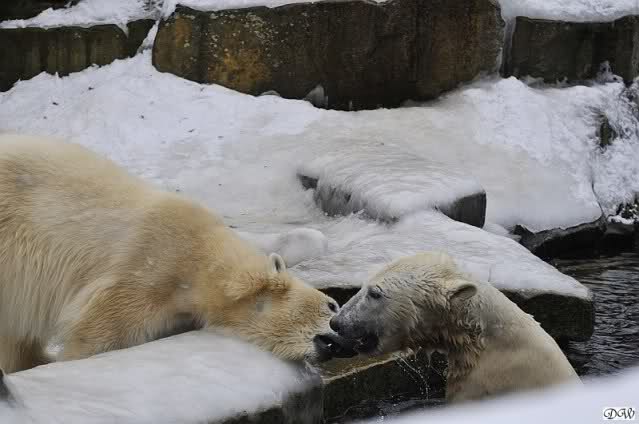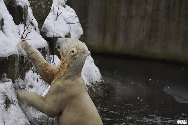 Schön war es bei Knut und Gianna. Bei unserer Ankunft spielte Knut im Wasser. Er hatte die letzten Futterreste eingesammelt und wartete auf Gianna. Sie kam auch hinunter zu ihm, ein kurzer Blick in den Graben – nichts da. Sie checkte, ob er noch etwas in der Schnauze hatte. Auch nichts. Also neckten sie sich eine Weile, er im Wasser, sie oben. Er versuchte sie ins Wasser zu bekommen. Sie hatte offensichtlich keine Lust. Erst sah sie nach, wie seine Junggesellbude aussieht, dann verschwand sie in zwei Sprüngen nach oben und drehte der Fernseher an. Es gab heute Kragi-TV. Knut planschte weiter im Wasser, wahrscheinlich hoffend, dass sie wiederkäme. Nichts da. Nachdem er noch ein bisschen mit den Eisschollen spielte, erklomm auch er den glatten Hügel. Ging zu Gianna, aber sie war nicht sonderlich interessiert. Daraufhin hatten wir dann zwei Eis-Lippenbären. Er machte eine Lippe weil sie nicht spielen wollte und sie, weil er sie immer wieder störte. Immer wenn sie sich wegdrehte, machte er Scheinangriffe in ihre Richtung, drehte sich dann zu den Besuchern als wollte er sehen, wie es ankam. Letztlich gab er auf und vergnügte sich allein. Allerdings ging der Blick immer wieder zu ihr. Witzig die Beiden.
