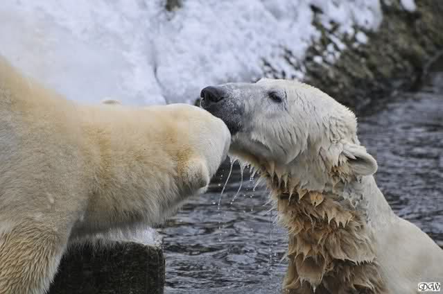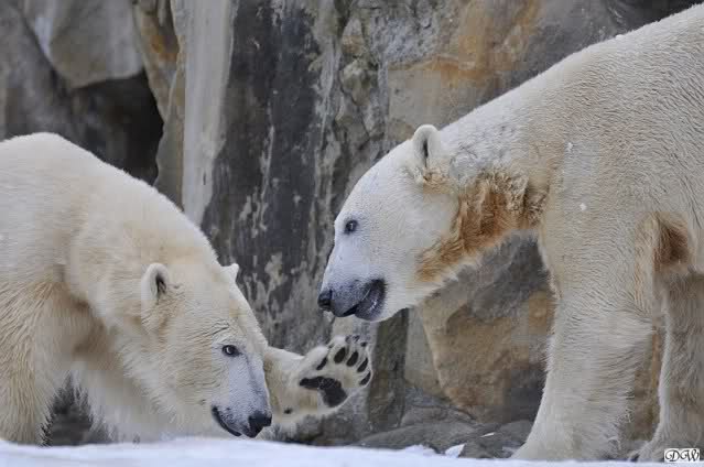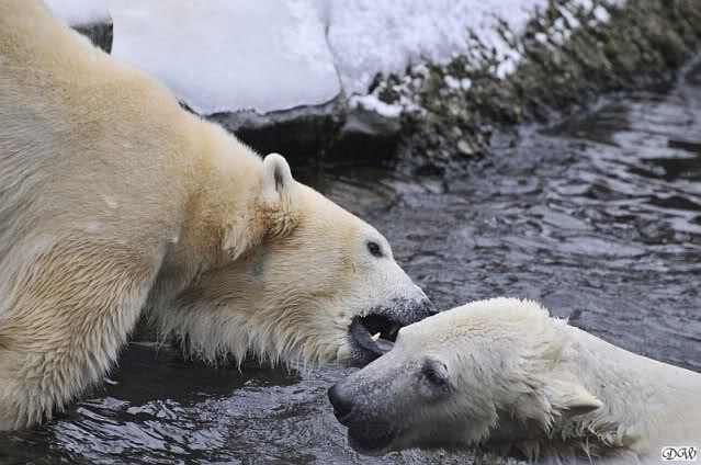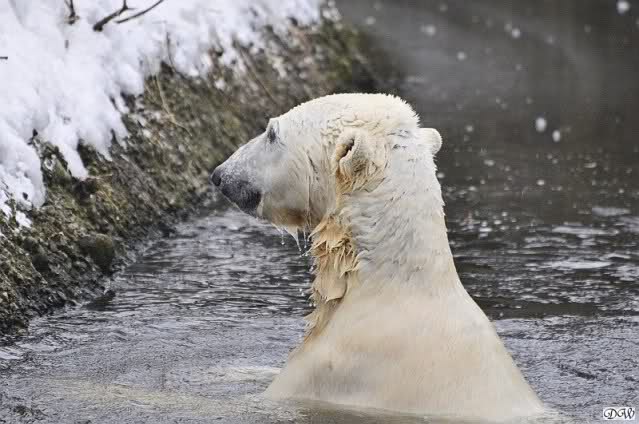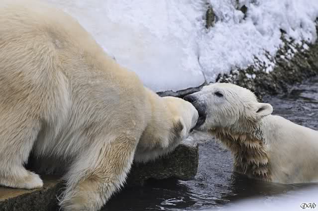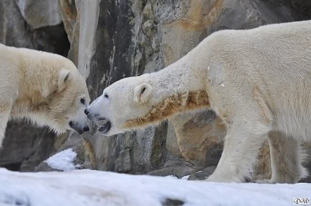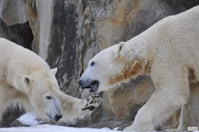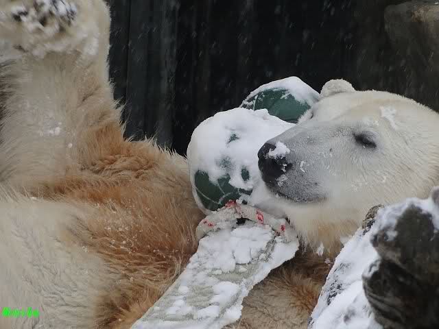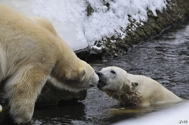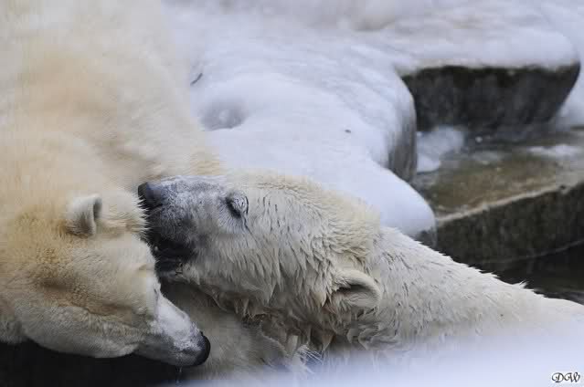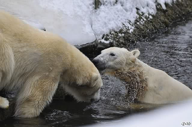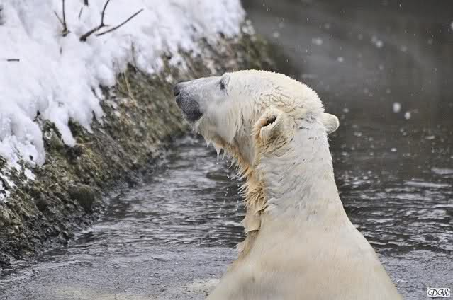 Schön war es bei Knut und Gianna. Bei unserer Ankunft spielte Knut im Wasser. Er hatte die letzten Futterreste eingesammelt und wartete auf Gianna. Sie kam auch hinunter zu ihm, ein kurzer Blick in den Graben – nichts da. Sie checkte, ob er noch etwas in der Schnauze hatte. Auch nichts. Also neckten sie sich eine Weile, er im Wasser, sie oben. Er versuchte sie ins Wasser zu bekommen. Sie hatte offensichtlich keine Lust. Erst sah sie nach, wie seine Junggesellbude aussieht, dann verschwand sie in zwei Sprüngen nach oben und drehte der Fernseher an. Es gab heute Kragi-TV. Knut planschte weiter im Wasser, wahrscheinlich hoffend, dass sie wiederkäme. Nichts da. Nachdem er noch ein bisschen mit den Eisschollen spielte, erklomm auch er den glatten Hügel. Ging zu Gianna, aber sie war nicht sonderlich interessiert. Daraufhin hatten wir dann zwei Eis-Lippenbären. Er machte eine Lippe weil sie nicht spielen wollte und sie, weil er sie immer wieder störte. Immer wenn sie sich wegdrehte, machte er Scheinangriffe in ihre Richtung, drehte sich dann zu den Besuchern als wollte er sehen, wie es ankam. Letztlich gab er auf und vergnügte sich allein. Allerdings ging der Blick immer wieder zu ihr. Witzig die Beiden.