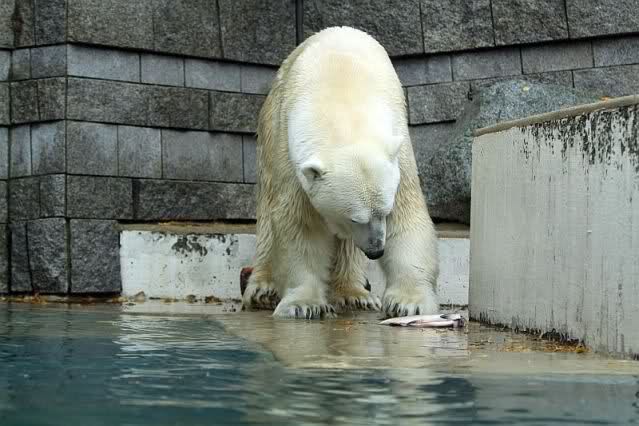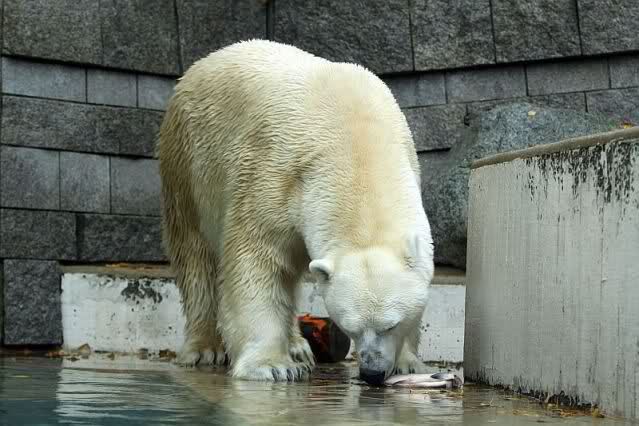 Nach der Seelöwenfütterung kam Lars’ Betreuer wieder zu uns und fütterte in aller Ruhe zuerst Jerka mit einem Lachs und anschließend liebevoll „seinen Großen“. Eine private Eisbärenfütterung - na, das war natürlich großartig. Zwischendurch erzählte er, wie sehr Lars das tiefe Wasser liebt und es genießt, darin zu tauchen und zu spielen. Lars sei ein wissbegieriger Bär, der sehr rasch das Gitter, hinter der die Futterküche liegt, erschnuppert hat. Lars hat sich sehr gut eingelebt und beide Eisbären verstehen sich prima.