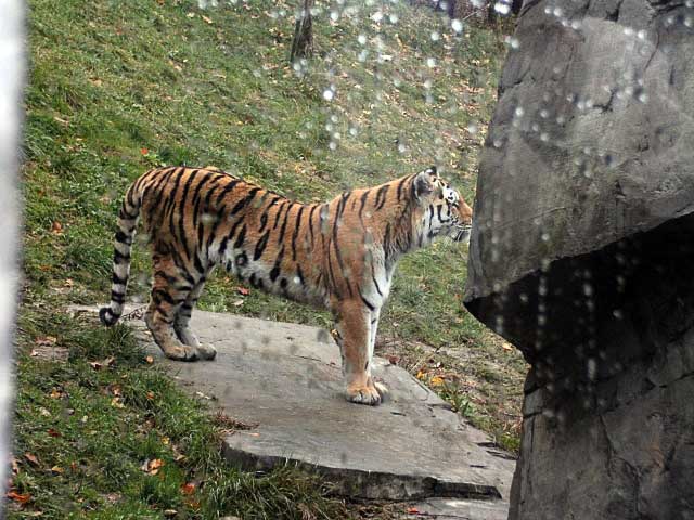 Lars sahen wir sofort, als wir um die Ecke bogen und bei ihm angekommen, war uns warm. Lars war alleine draußen und wir konnten uns in Ruhe mit ihm unterhalten. Jerka hatte sich noch ein wenig aufs Öhrchen gelegt und kam erst später zu uns. Es war auch alles andere als gutes Fotowetter, die hohen Scheiben vor dem Gehege waren nass und voller Tropfen, eine Leiter wäre jetzt von Vorteil gewesen.
