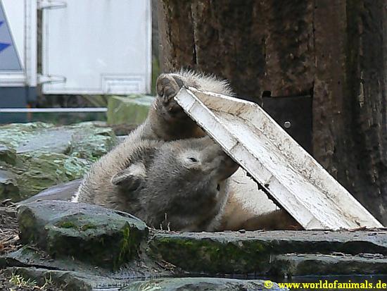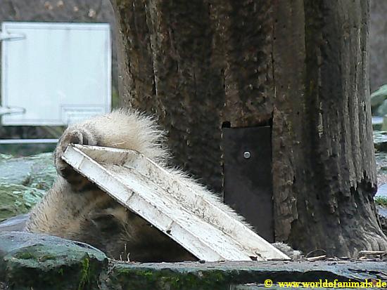 ich war heute wieder im Zoo. Als ich gegen Nachmittag dort eintraf spielte Knut wieder herrlich mit seinem Jutesack. Er hielt ihn in der Schnauze und warf in hin und her und über seinen Kopf. Wenn er ihn fallen ließ, gab es ein Geräusch als wenn etwas aus Holz darin ist. Er hat auch einen Quitschball darin auf dem er mit Begeisterung rumsprang. Es ist doch immer wieder erstaunlich mit wie wenig Dingen sich Knut sehr lange beschäftigen kann. Eine Knutfreundin brachte einen ganzen Lachs mit. Die Hälfte bekam Lars am Vormittag. Die andere Hälfte Knut. Der Lachs wurde in den kleinen Teich geworfen, wo Knut in rausholte und nach oben in seine Sandkuhle unter dem Baum trug. Ich habe Knut noch nie so lange und so genüßlich an einem Fisch fressen sehen. Danach leckte er seine Vorderpfoten vorne und hinten ab, als wenn er sagen wollte: war das lecker.Dann gings ans verspeisen vom Salat und den Weintrauben, die er auch sehr mag. Er ging dann wieder nach oben zu seinem Mulchbett und rollte sich vergnüglich hin und her. Natürlich immer schauend, ob wir ihn beobachten. Ich habe heute wieder nette Knutfreunde getroffen. Dann machte ich meine Runde durch den Zoo. Bei Familie Otter vorbei. Sie waren auch alle draußen und tobten durch das Gehege. Dann weiter zu den Robben. Es war gerade Show. Auch sehr interessant sich das anzusehen. Danach ging ich durch die Papageienhäuser, die zum Teil sehr hübsch angelegt sind und auch einen Besuch wert sind. Bei Knut wieder angekommen wurde es langsam dunkel. Es waren aber immer noch Besucher dort. Ich bin dann gegangen. Es war wie immer ein schöner Tag.