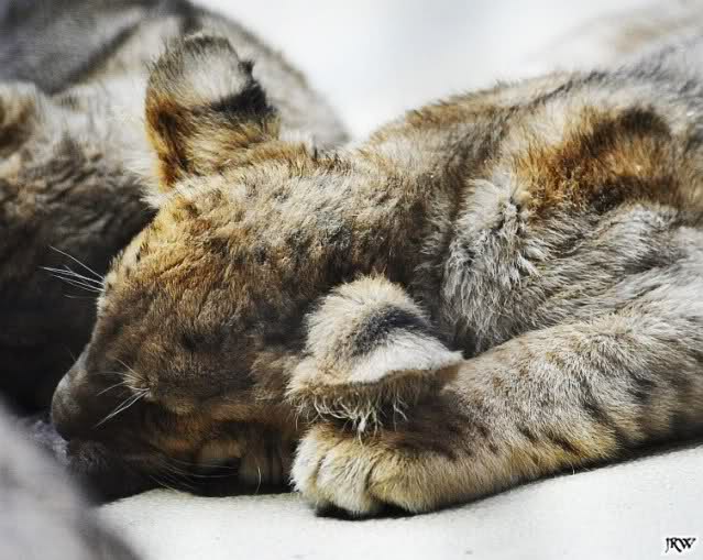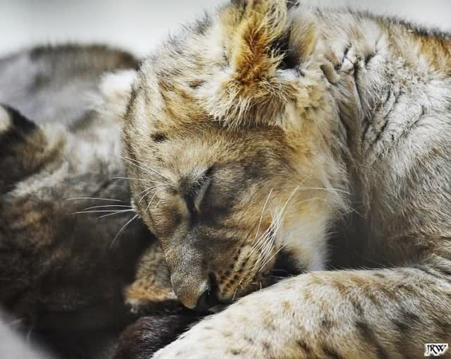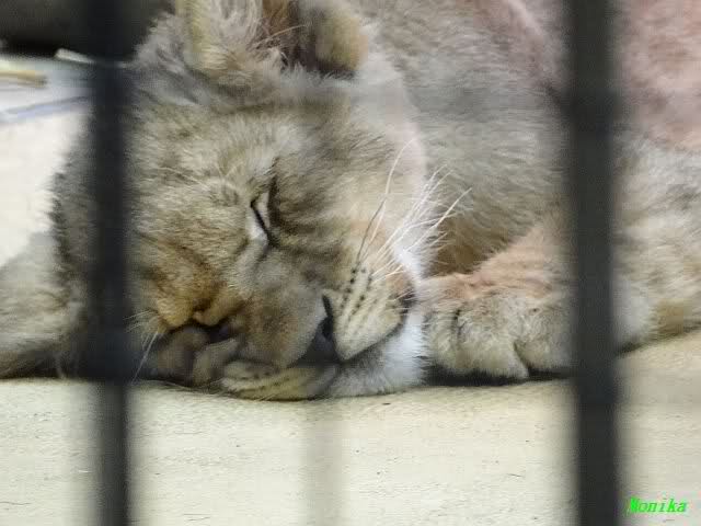 Natürlich ging ich auch ins Raubtierhaus um mich davon zu überzeugen, dass die kleinen Löwen noch da sind. Sie sind noch da. Die Kleinen sind umgezogen in einen anderen Käfig. Ein Kleiner lag unter der Rotlichtlampe und das Brüderchen davor.