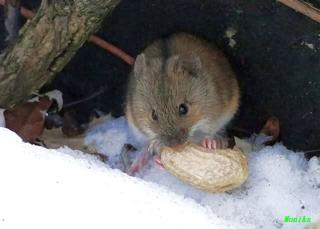 Diese kleine Maus nahm die Nuss und trug sie in ihr Schneeloch.