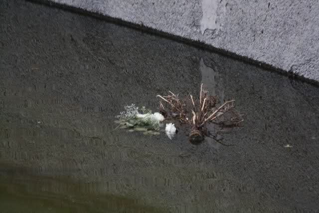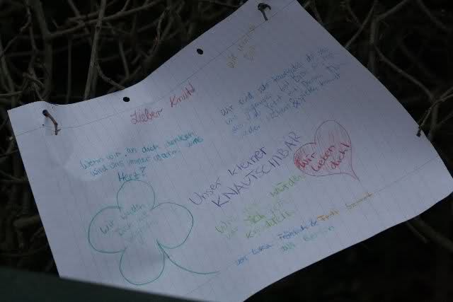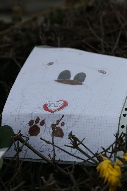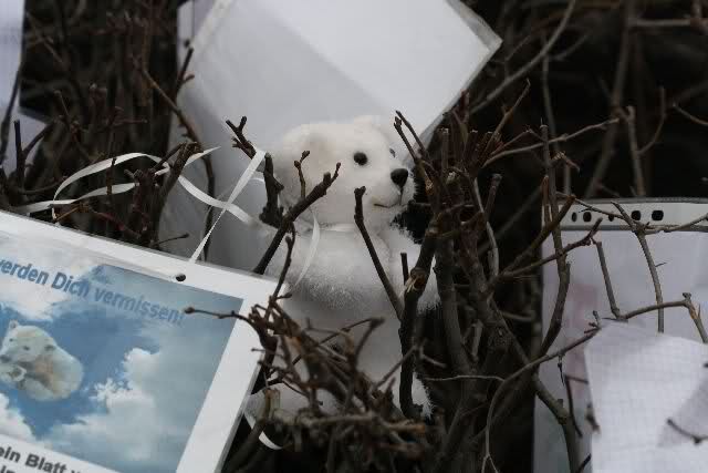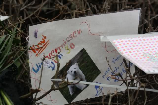 Heute waren sehr viele Schulklassen bei "Knut" und haben Blumen und Zeichnungen am Gehege niedergelegt.