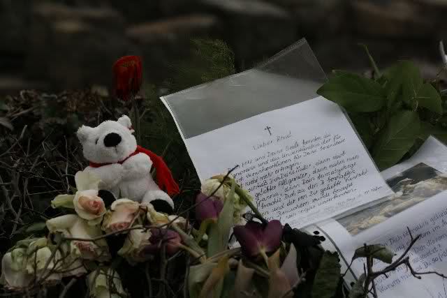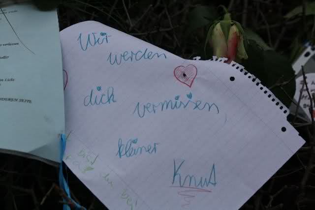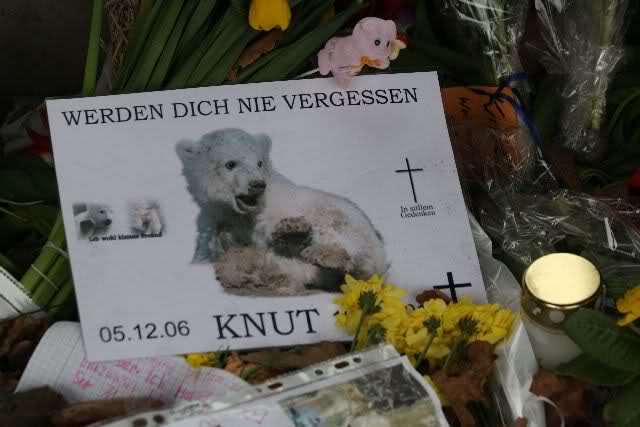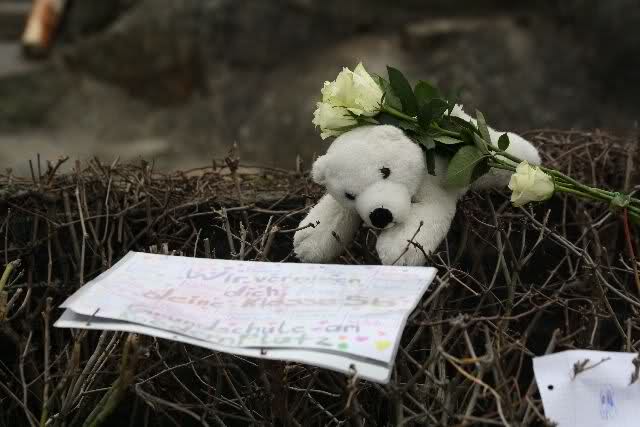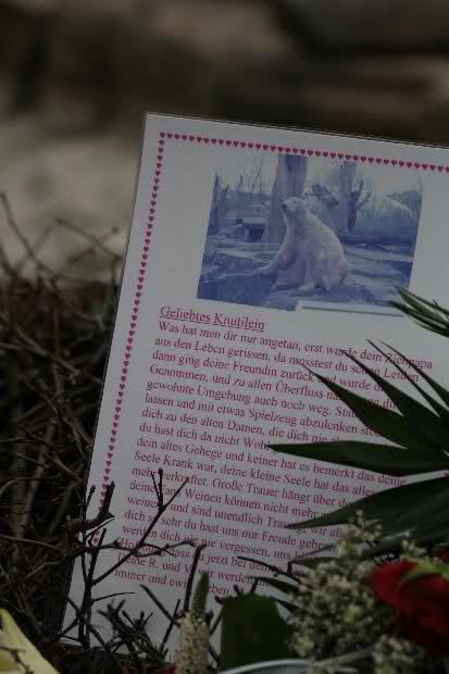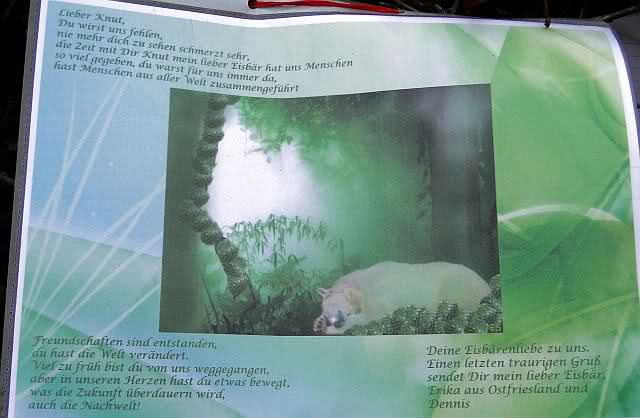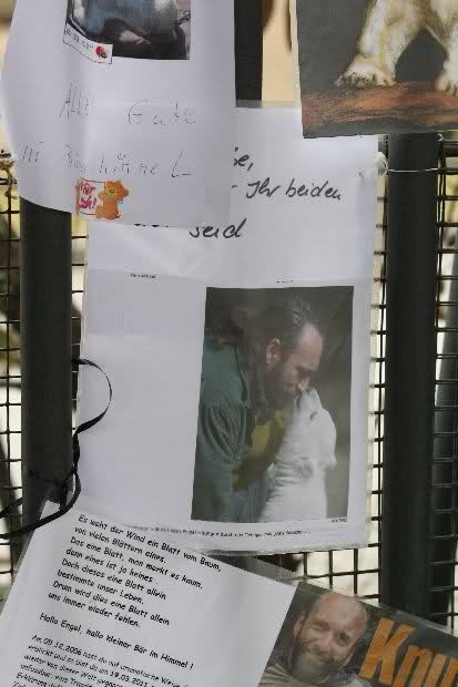 Auch heute waren Schulklassen an der Anlage, um sich von Knut zu verabschieden. Von einer Grundschulklasse sagte der Lehrer zu mir, daß sie mit Knut groß geworden sind. Viele dieser Kinder legten Blumen, selbstgemalte Bilder und Stofftiere an die Anlage. Ein Mädchen weinte bitterlich und wurde von den Mitschülerinnen getröstet.
