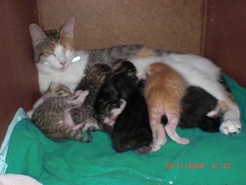 Sie hat 7 Kinder bekommen und alle durchgefüttert. Für 4 Kinder hat meine Tochter die Familien gefunden. Eine dreifärbige Katze möchte sie mit der Mutter behalten. Die zwei Kätzchen kommen wahrscheinlich im Sommer zu uns.