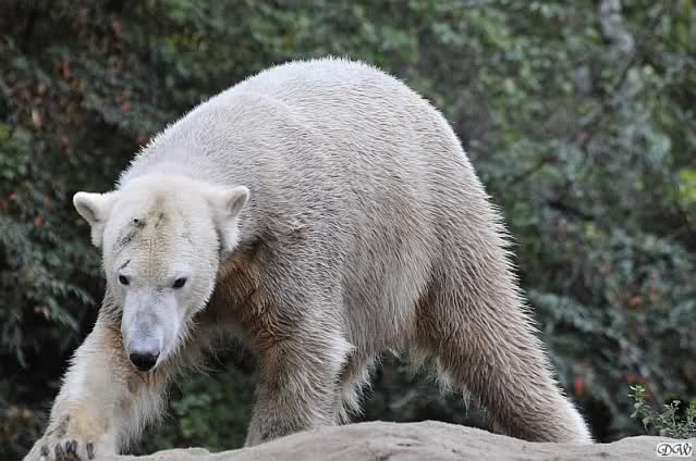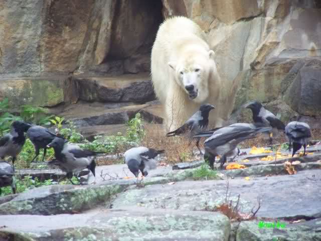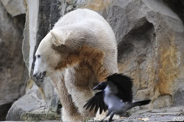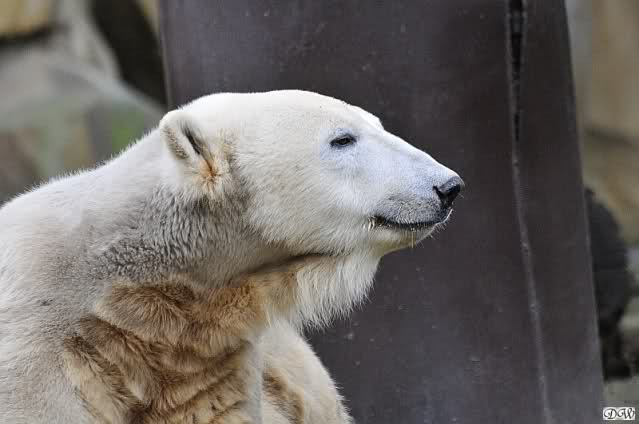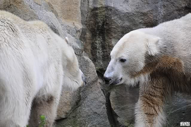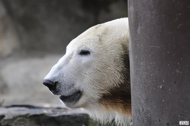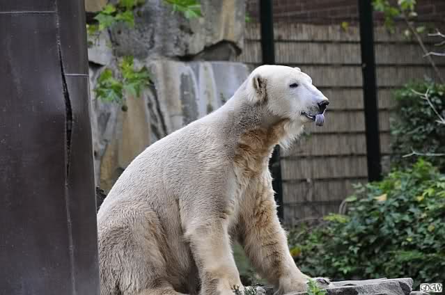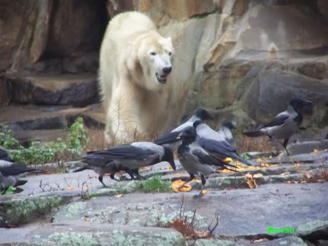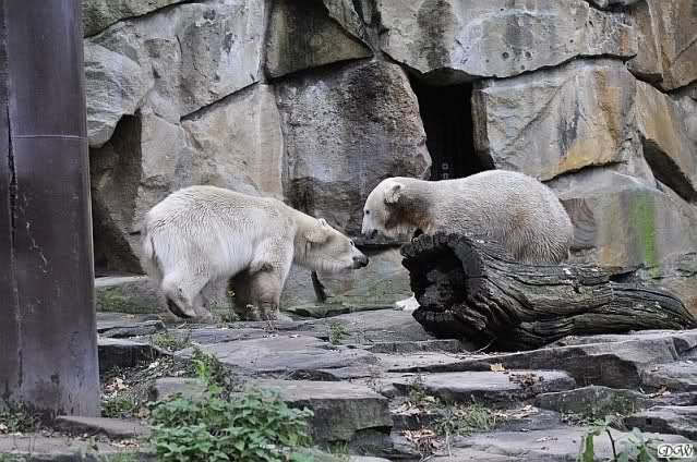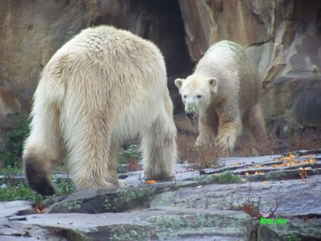 Eine Überraschung hatte er aber doch doch parat heute. Der Schieber ging auf und hinein flitzte - Knut, nicht Gianna. Gianna blieb draußen und war ganz offensichtlich verwirrt. Später ging sie hinein, lief drinnen hin- und her, kam wieder heraus und war unruhig. Als wir den Zoo verließen, lief sie noch immer hin und her. Offensichtlich fand sie diese neue Situation nicht prickelnd.