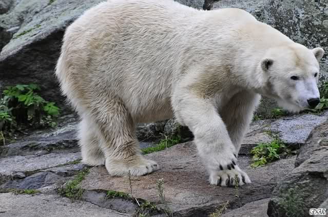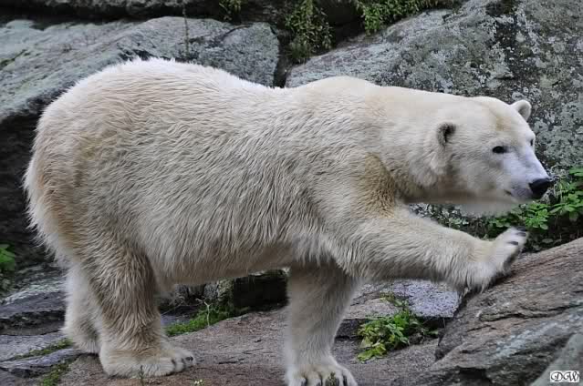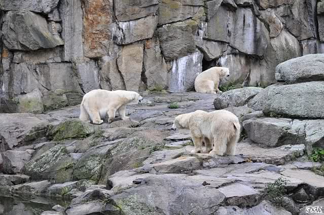 Nach der Fütterung lief Knut über die Anlage und stellte sich vor Katis Höhle. Kati sah dies und kam an. Beide brummten sich an bis Kati sich zurückzog. Als Knut runter zu seinem Felsen wollte, kam Kati angerannt. Ich wußte gar nicht, daß sie so schnell rennen kann. Knut drehte sich dann um und Kati stoppte. Und ging zurück.