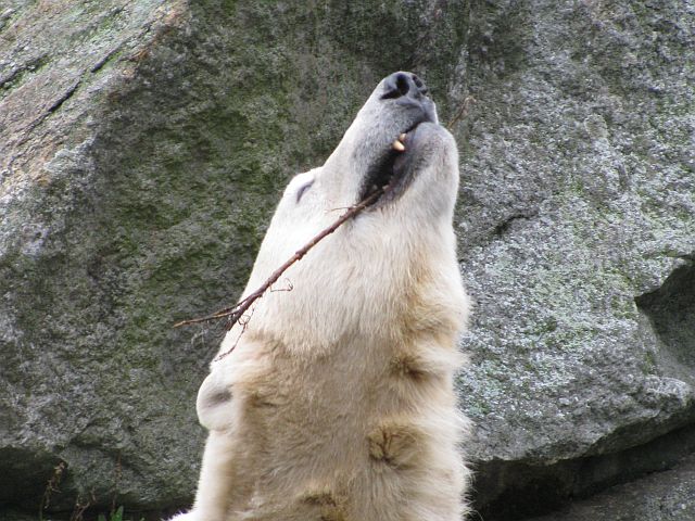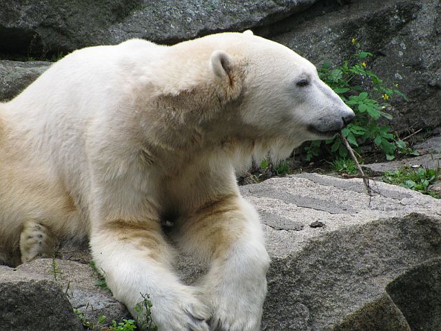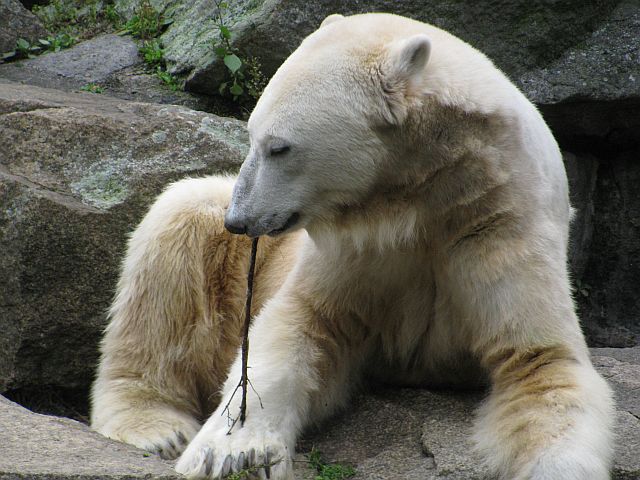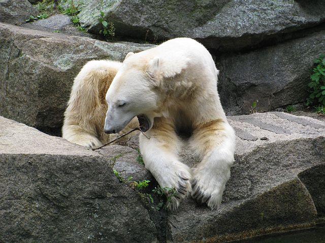 Besuch bei Knut und Co. am späten Nachmittag. Tosca führte heute die große Lippe. Als Knut in der Mitte der Anlage saß, kamen die drei Großen und blafften ihn an. Die Lauteste war Tosca. Nach einer tollen Tapirlippe entschloss sich Knut lieber wieder zu seinem Plateau zu gehen. Dort friemelte er so lange in einer kleinen Spalte umher, bis er kleine Grashalme herausgeholt hatte und spielte mit den kleinen Gräsern.