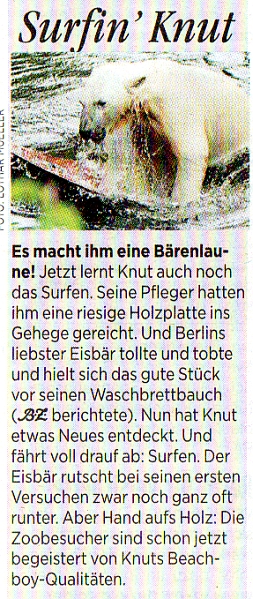 zu ungewohnt früher Stunde in einer lauen Sommernacht wünsche ich allen Knut Freunden einen guten Start in den Sonntag. Es wird wieder ein heißer Tag mit 32 Grad in der Spitze werden. Nicht unbedingt Eisbärwetter. Aber Knut wird sich vielleicht auf sein Surfbrett schwingen oder aber den Tauchsport vorziehen.