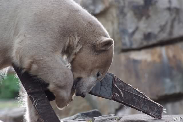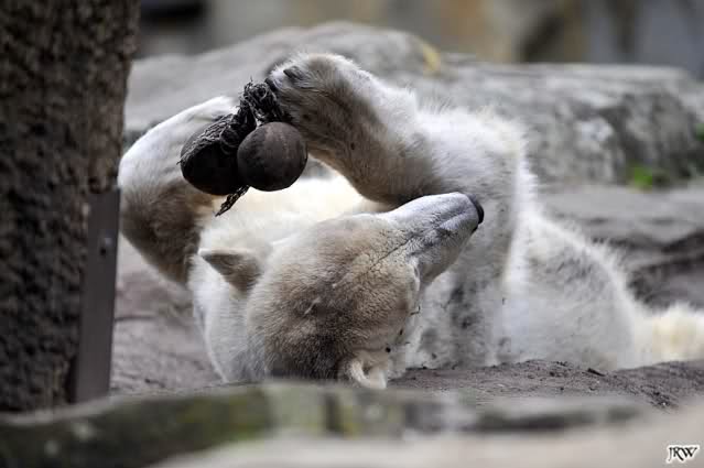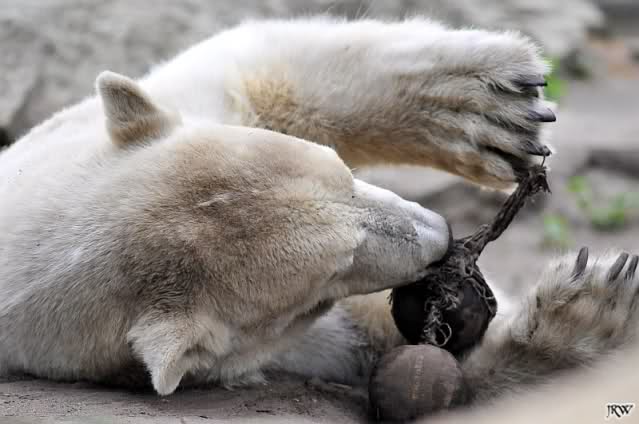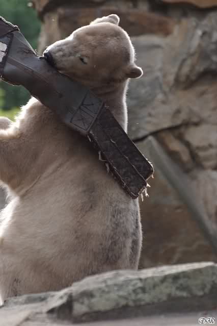 Als ich heute Nachmittag in den Zoo ging spielte Knut mit seinem Nackthuhn. Zum Schluß schnappte er sich sein Huhn und verschwand in der Höhle.