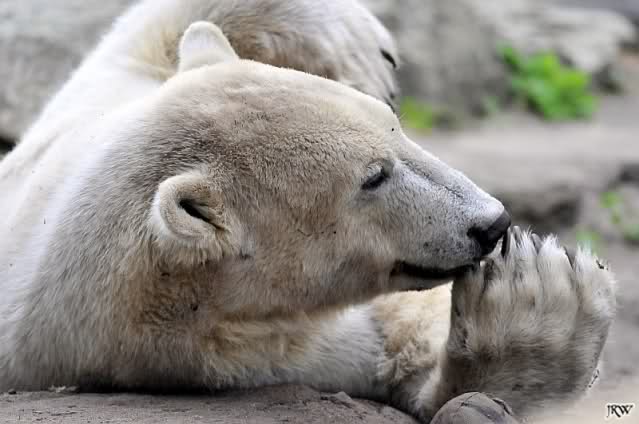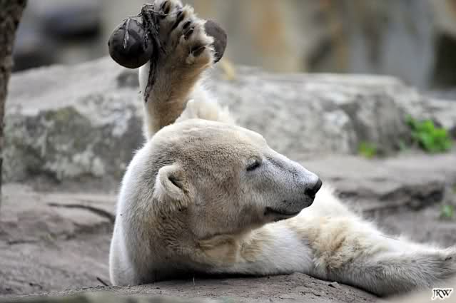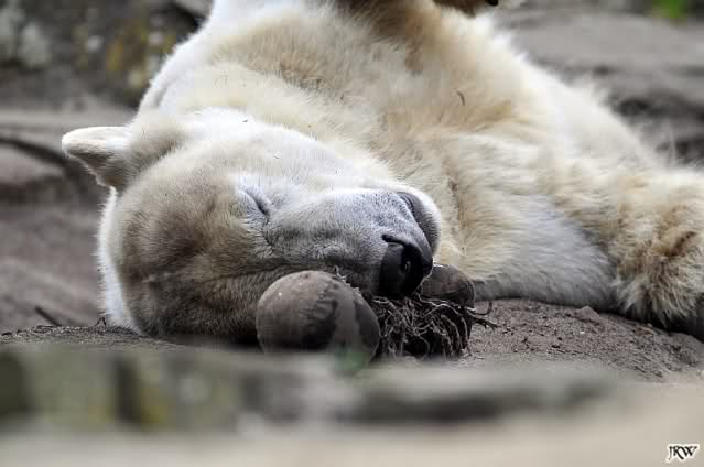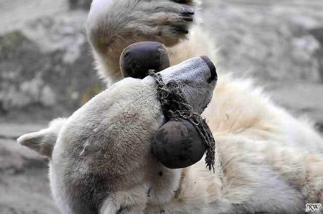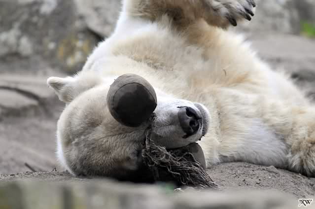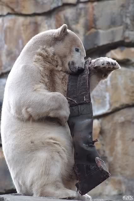 Knut bekam heute einen neuen Jutesack, der liebevoll (nach Anweisung eines Tierpflegers) genäht und gefüllt wurde. Er soll begeistert damit gespielt, sich dann damit zur Ruhe gelegt haben. Als er wieder aufstand entschied er sich doch für sein Nackthuhn. Auch heute hatte er keine Zeit für einen Hungermarsch. Auf eigene Bilder vom Jutesack müssen wir leider noch warten, da wir zu spät in den Zoo kamen. Aber egal was Knut macht, schön ist er allemal. Meint Ihr nicht?