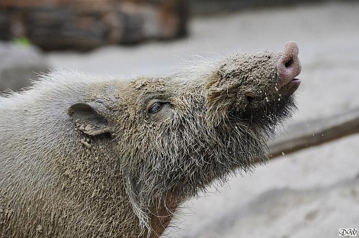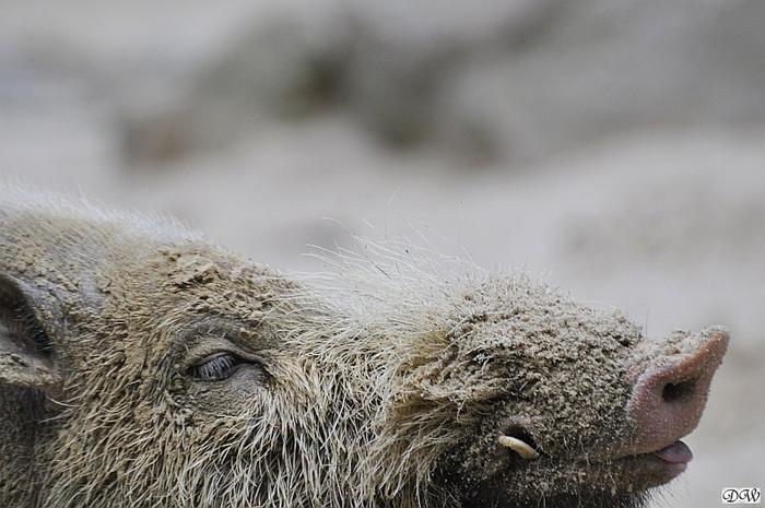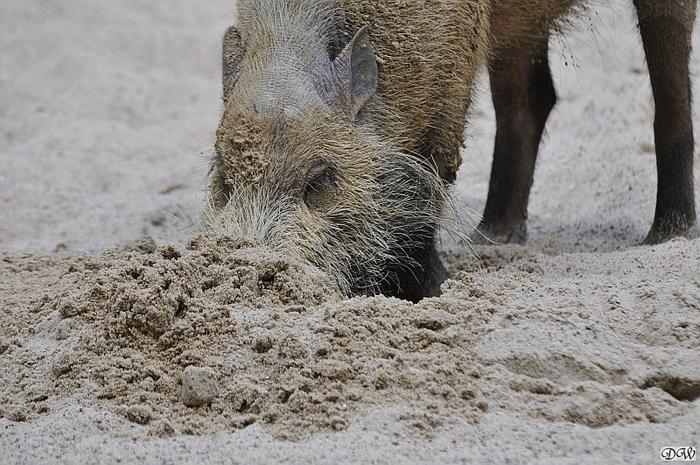 Neo pflügt und gräbt seit fast einer Woche die neugestaltete Anlage um. Der Sand wurde vollkommen ausgetauscht und eine Drainage eingebaut. Somit müssen die Bartschweine wenigstens nach viel Regen nicht wochenlang im Schlamm stehen. Neo scheint es außerordentlich zu genießen soviel Platz und losen Sand zu haben. Wenn man ihn ruft, kommt er noch immer und antwortet mit einem Grunzen.