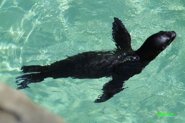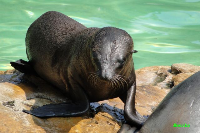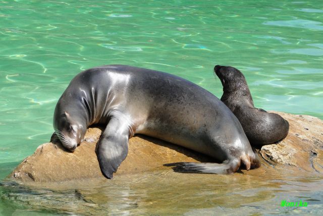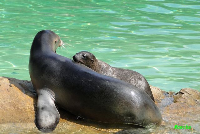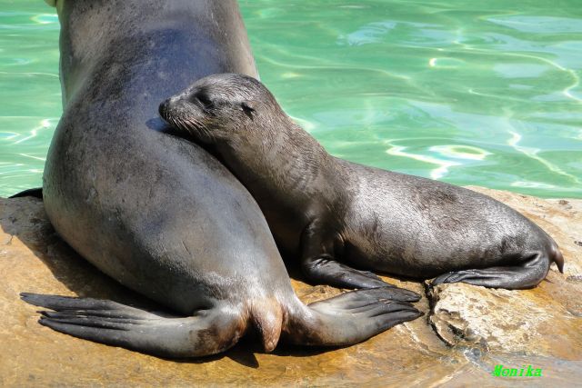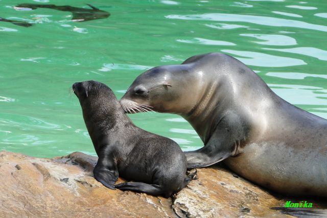 Heute Vormittag waren die beiden Seelöwenbabys das erste Mal auf der Außenanlage. Es sind zwei Mädchen. Beide Mütter waren sehr aufgeregt und machten lautstark klar, dass die anderen Seelöwen die Babys in Ruhe lassen sollen. Diego, der mit den Kleinen spielen wollte, wurde auch verjagt. Die Babys sahen das alles viel cooler. Eines der Kleinen ist ertwas kleiner als das andere.