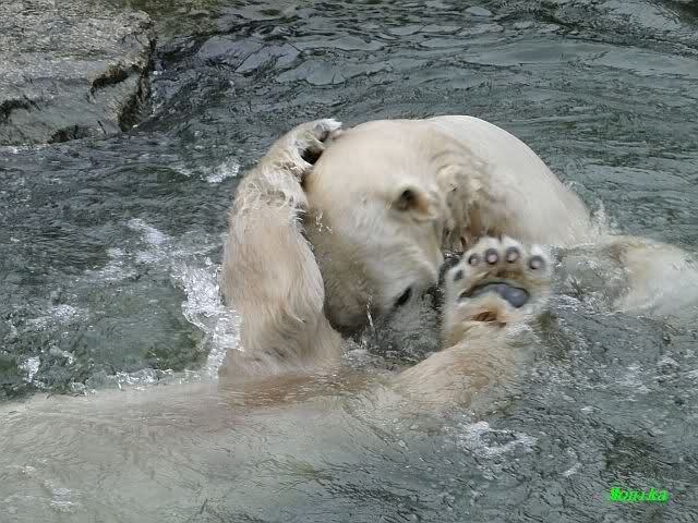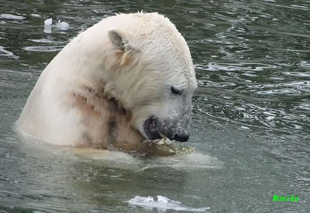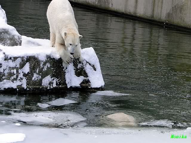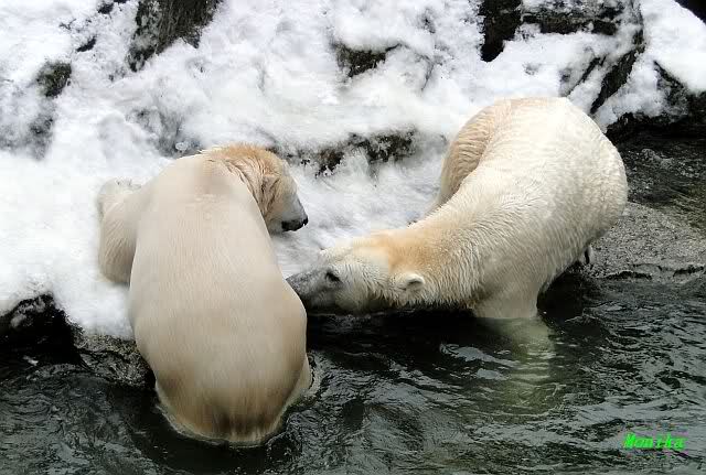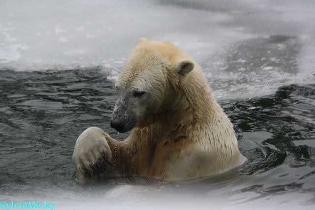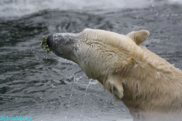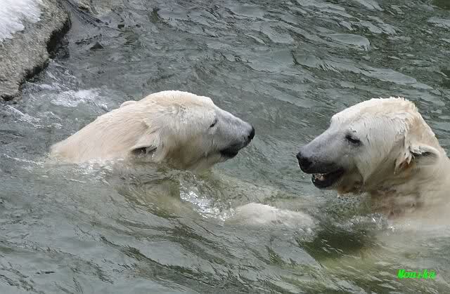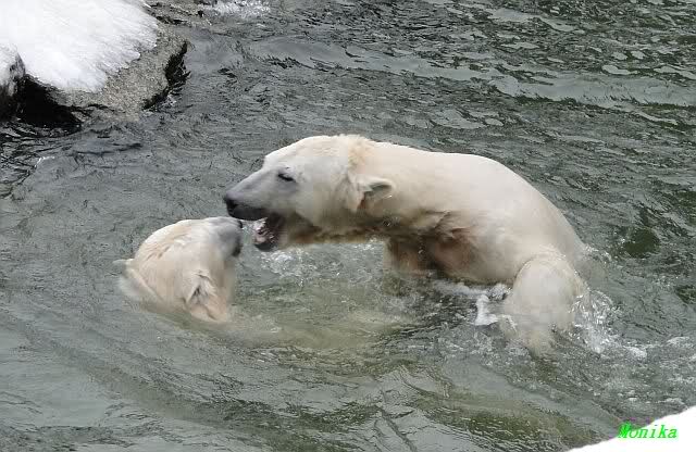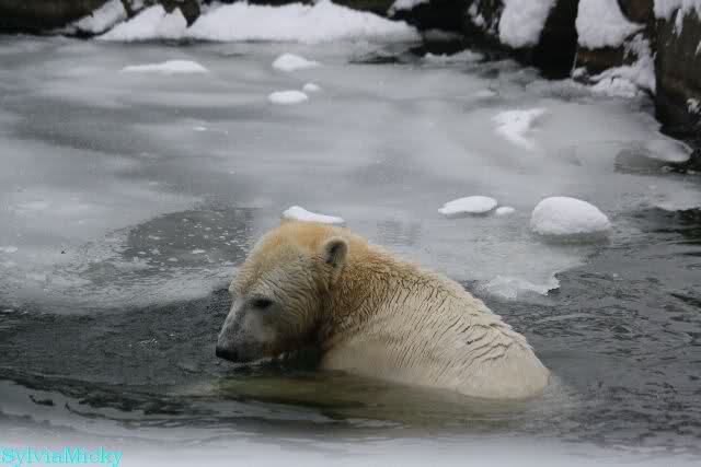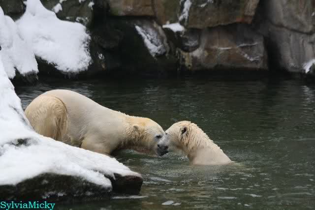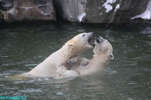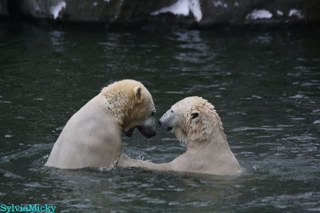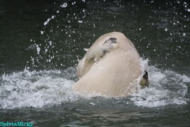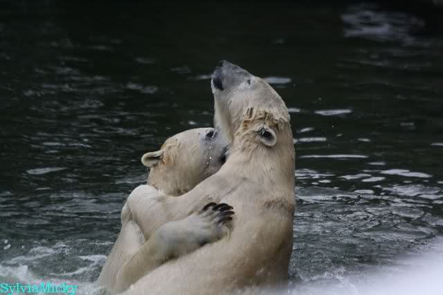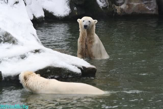 Heute habe ich es endlich live gesehen, wie Knut und Tosca im Wasser tobten. Es ist wunderschön anzusehen. Als Tosca nach einer Weile aus dem Wasser ging, schaute Knut ihr lange nach.