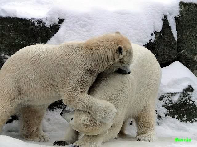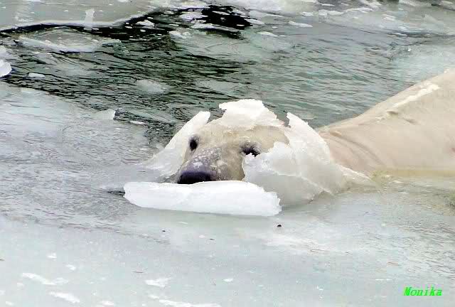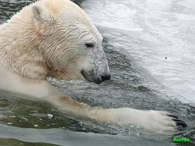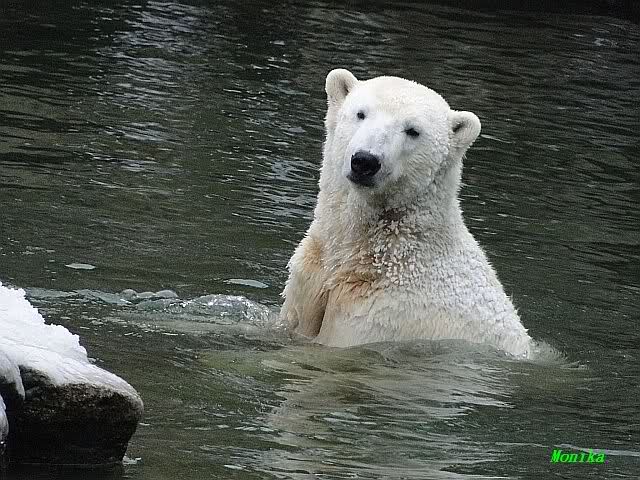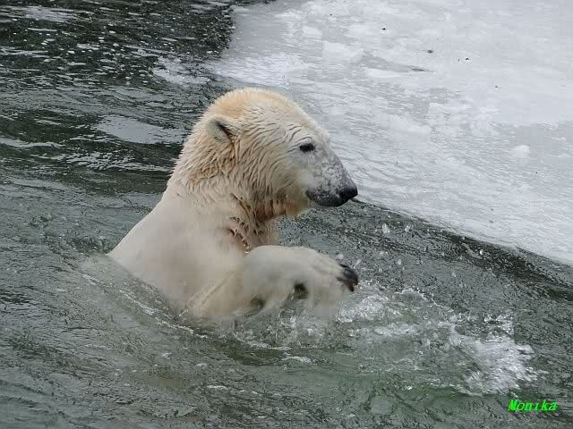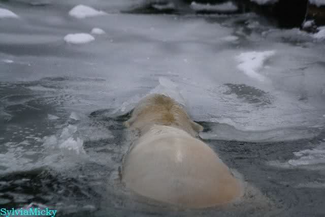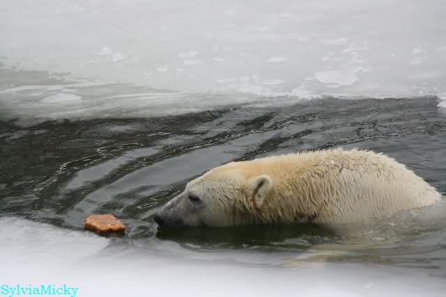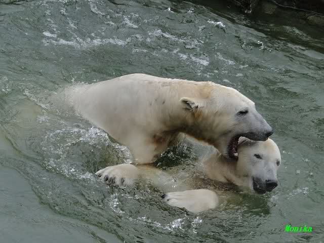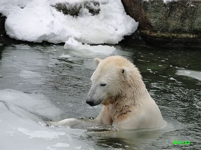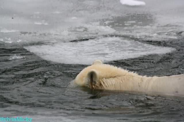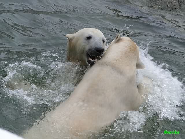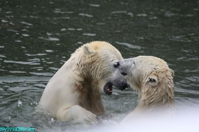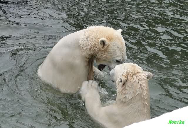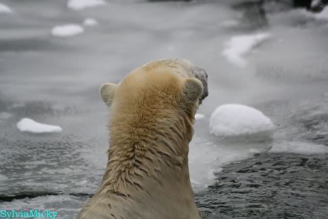 Heute habe ich es endlich live gesehen, wie Knut und Tosca im Wasser tobten. Es ist wunderschön anzusehen. Als Tosca nach einer Weile aus dem Wasser ging, schaute Knut ihr lange nach.