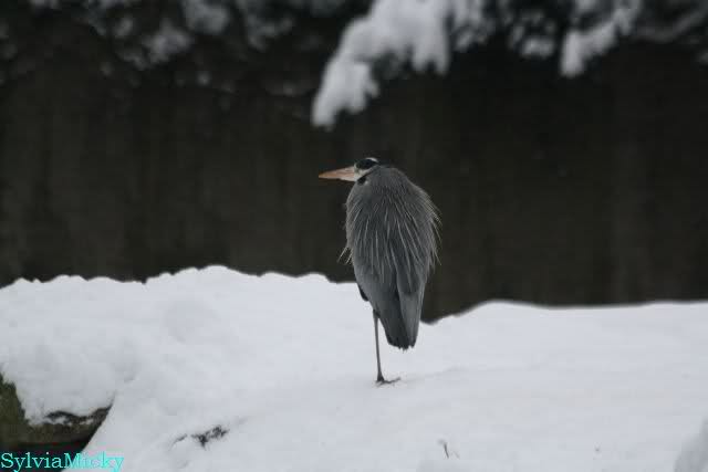 Am Abend wärmten sich die Fischreiher in den Gewässern einiger Anlagen (Ottern und Robben) ihre Beine, den Kopf eingezogen und dick aufgeplustert.