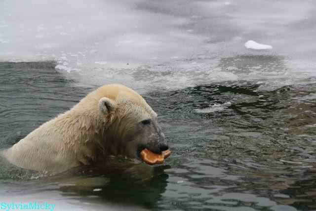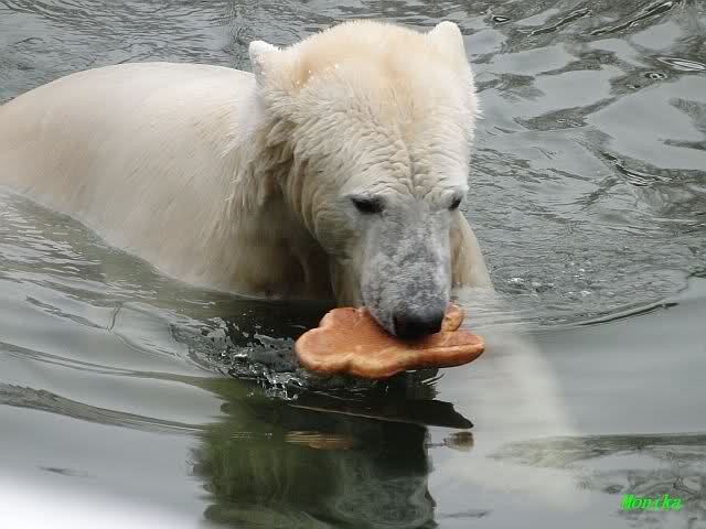 Als bei der Fütterung Brot ins Wasser fiel(Spreewaldmarion meinte es wäre etwas selbst gebackenes), ging Knut ins Wasser und holte sich das Brot. Ich habe Knut noch nie ins Wasser gehen sehen, wenn das Futter nicht nach Fisch oder Fisch aussah. Wieder ein Fortschritt.