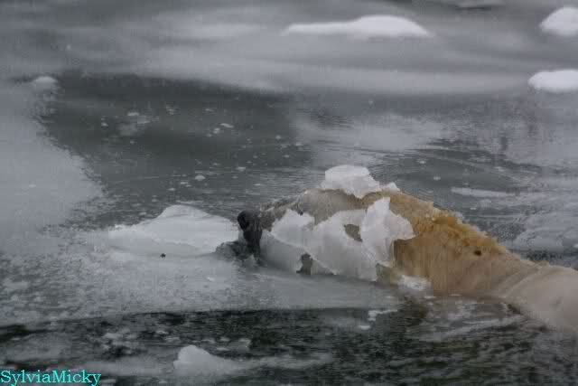 Heute sah ich das erste Mal, dass sie sich richtig gebalgt haben, und nicht nur "Schnauzenkontakt". Sie haben auch heute zusammen im Wasser gespielt, zuvor hatte sich Tosca als Eisbrecher betätigt.