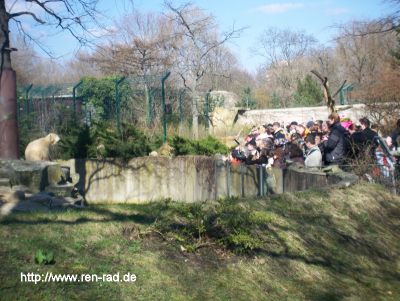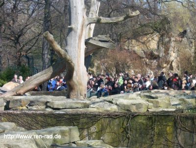 Gestern war ein wunderschöner, sonniger Tag im Zoo und für sehr viele Berliner und Besucher aus den unterschiedlichsten Ländern eine Gelegenheit Knut zu besuchen; es war fast wie in "alten Tagen". Dicht an dicht gedrängt harrten wir der Fütterungszeit entgegen. Hier ein Teilbereich vor Knut`s Gehege mit den vielen Menschen davor. Ich habe die Fotos extra sehr verkleinert, damit sich keiner wiedererkennen kann.