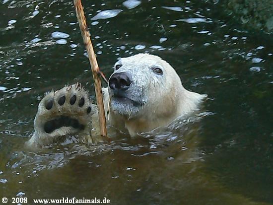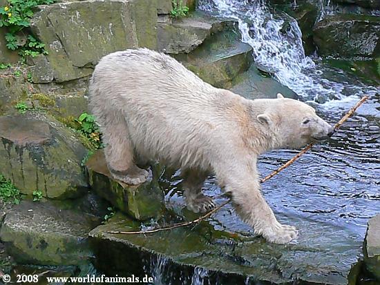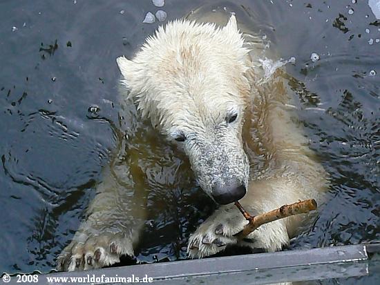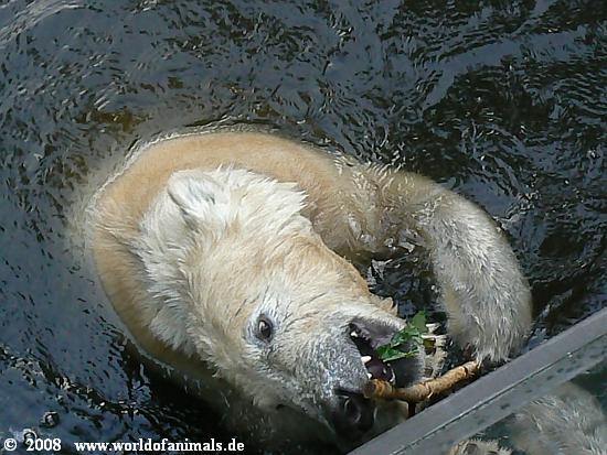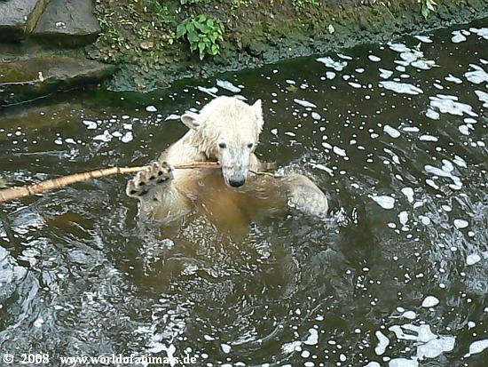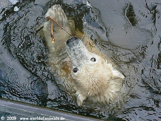 Samstagabend im Zoo. Gegen 18 Uhr begann es sehr stark zu regnen. Das trieb, bis auf ganz wenige Ausnahmen, die Zoobesucher nach Hause. Auch Knut verzog sich in seine Höhle. Gegen 18:30 h hörte der Regen auf. Knut schaute noch einmal kurz aus der Höhle heraus und ... entdeckte uns drei restlichen Besucher, die dem Regen getrotzt hatten. Das war der Start für ein ausgiebiges Spiel mit einem Zweig im Wasser. Inzwischen waren es fünf Besucher denen unser kleiner King eine *Extravorstellung* gab.