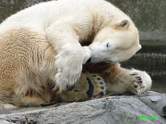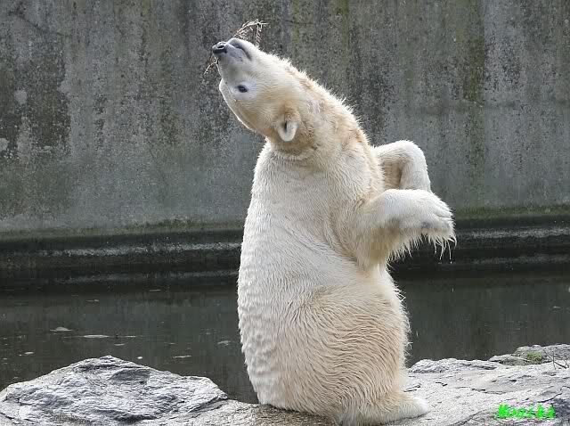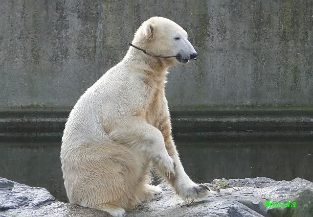 Das ging auch nach der Fütterung so weiter. Knut blieb auf der Insel. Er beschäftigte sich, wie bereits vor der Fütterung, mit Zweiglein und machte oft "Sitzmännchen".